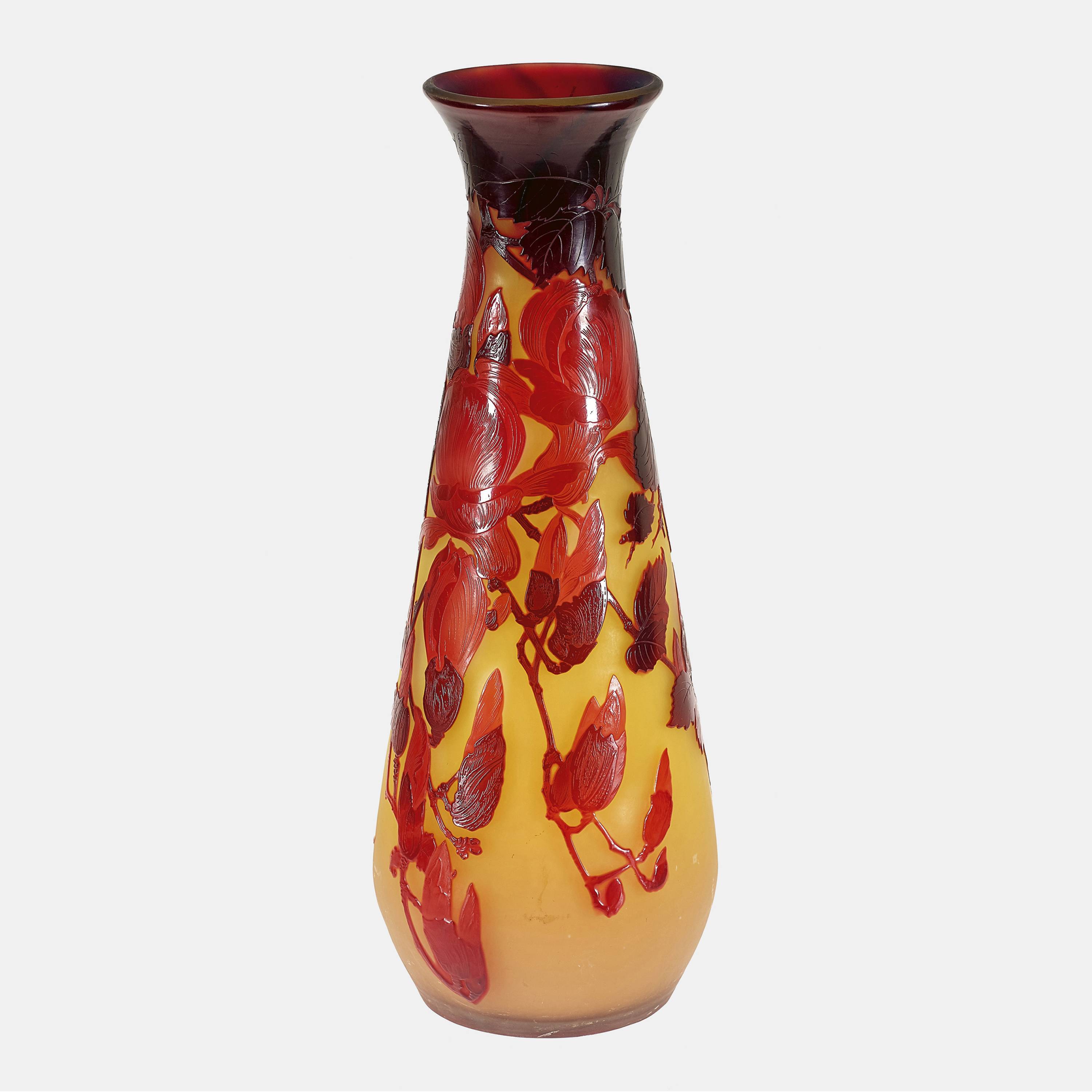 Opakes Glas mit gelben Pulvereinschmelzungen, hellrot und weinrot überfangen und geätzt, Binnenzeichnung in feiner Hoch- und Nadelätzung, a. Wandung erhaben bez. "Gallé",
