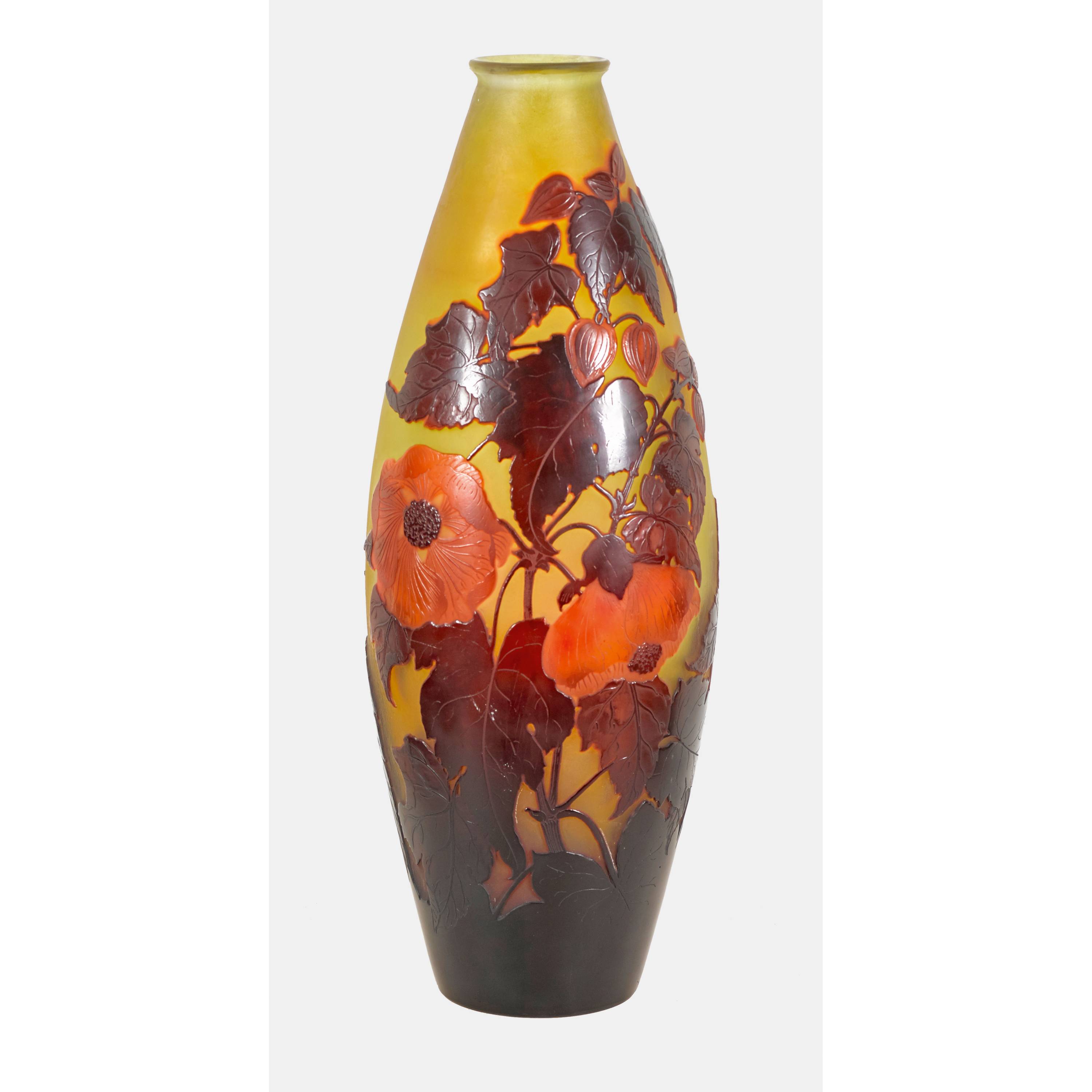 Opakes Glas mit gelben Pulvereinschmelzungen, hellrot und weinrot überfangen und geätzt, Binnenzeichnung in feiner Hoch- und Nadelätzung, a. Wandung erhaben bez. "Gallé",
