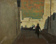 Strassenzug im Schatten mit Passanten.