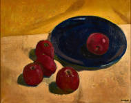 Stillleben mit Äpfeln und blauer Schale.