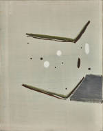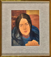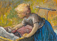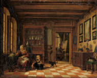 Interieur mit stickender Frau, Kind und Maler an der Staffelei.