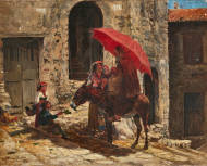 Der Besuch des Paters mit Esel und rotem Sonnenschirm.