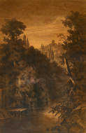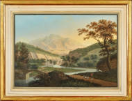 Landschaft mit Festung und Kuhherde.