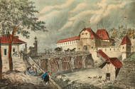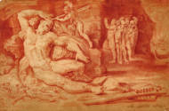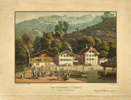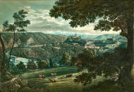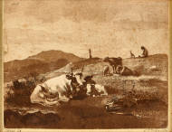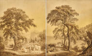 Landschaft mit Kühen, Schafen, Hirt und Hund.