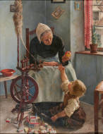 Interieur mit älterer Frau und Kleinkind am Spinnrad.