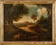 Landschaft mit Bauer, Ochsenpaar und Burg.