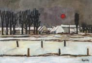Verschneites Dorf unter rotem Vollmond.
