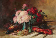 Stillleben mit Rosen, Trauben, Fasan und Hummer.