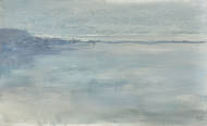 Bedeckte Seelandschaft im Nebel.