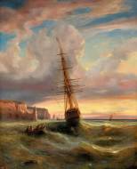 Segelschiff vor felsiger Küste.