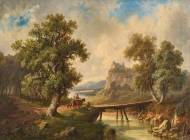 Landschaft mit Burg und rastenden Säumern an einem Steg.