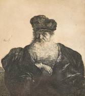 Alter Mann mit Bart, Pelzmütze und Samtmantel.