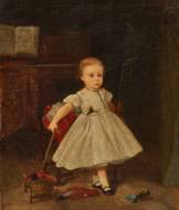 Weisse Christrosen in blauer Vase mit Spielzeugpferd.