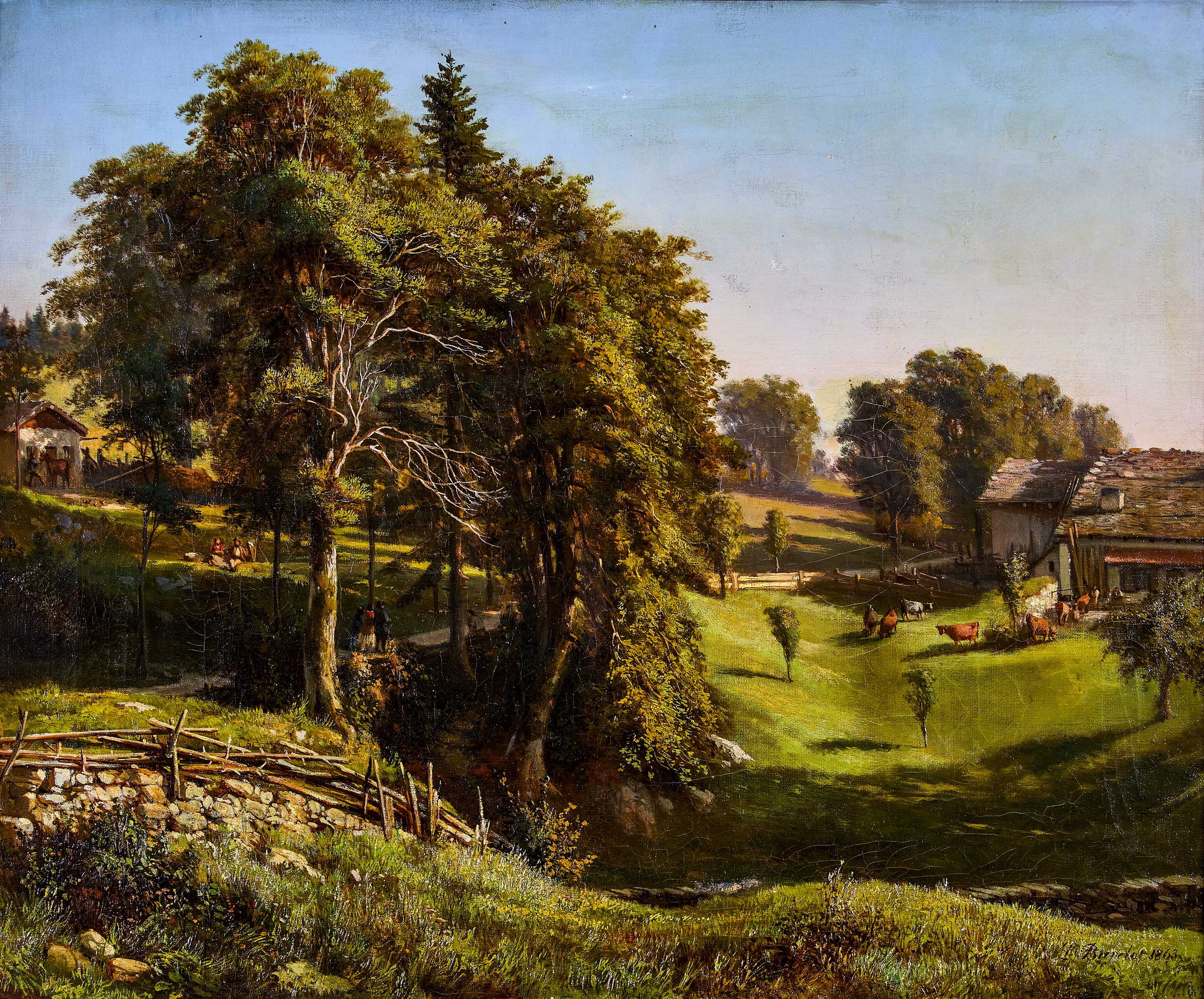 Das angebotene Gemälde entstammt der Zeit kurz vor Louis Buvelots Übersiedlung nach Australien. Es zeigt ein Gehöft in typisch jurassischer Landschaft und verweist bereits auf jene Fähigkeit des Künstlers, die er in Australien noch vervollkommnen sollte: die meisterhafte Wiedergabe einer natürlichen Landschaft mit all ihren intimen Details.