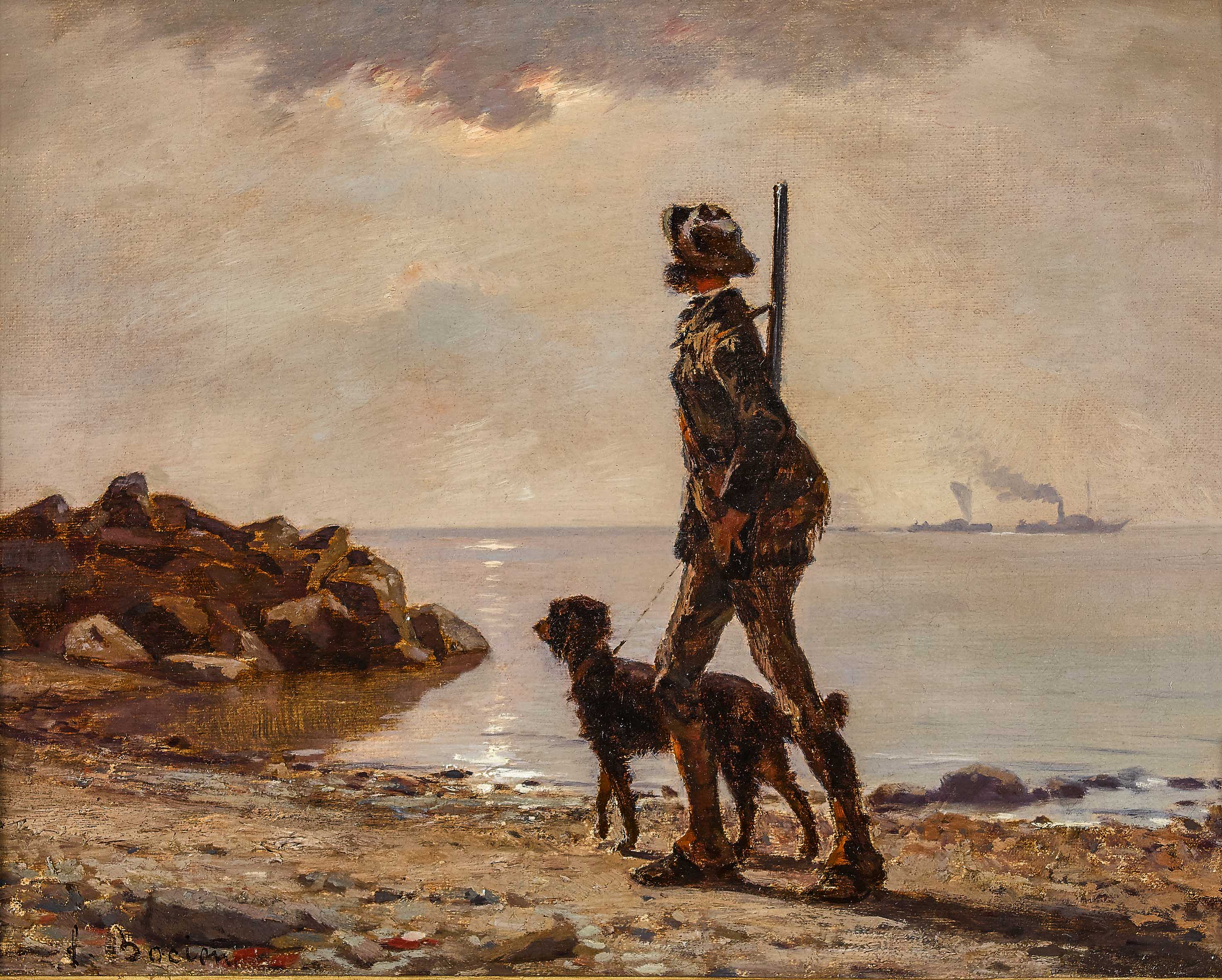 Die angebotene Komposition präsentiert eine ins warme Licht des Sonnenuntergangs gehüllte Seelandschaft beim heutigen Lausanner Stadtteil Vidy. Wie ein 1879 auf Karton gemaltes kleinformatiges Werk von François Bocion belegt, griff der Künstler das Sujet zweimal auf. Bei der vorliegenden Variante sind Jäger und Hund jedoch deutlich in den Vordergrund gerückt und im verlorenen Profil dargestellt. Ihr weitschweifender Blick erweckt den Eindruck einer vollkommenen Ruhe und des harmonischen Einklangs zwischen Natur, Mensch und Tier.