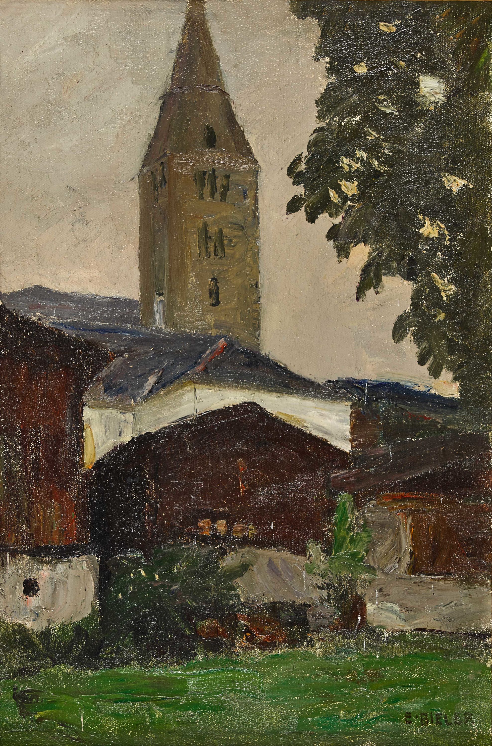 Im vorliegenden, um 1900 zu datierenden Werk ist die gotische Pfarrkirche Saint-Germain in Ernest Biélers Walliser Heimatdorf Savièse festgehalten. Intensiv am Gemeindeleben teilnehmend, war der Künstler zusammen mit dem Dorfpfarrer auch an der Renovation der genannten Kirche beteiligt.