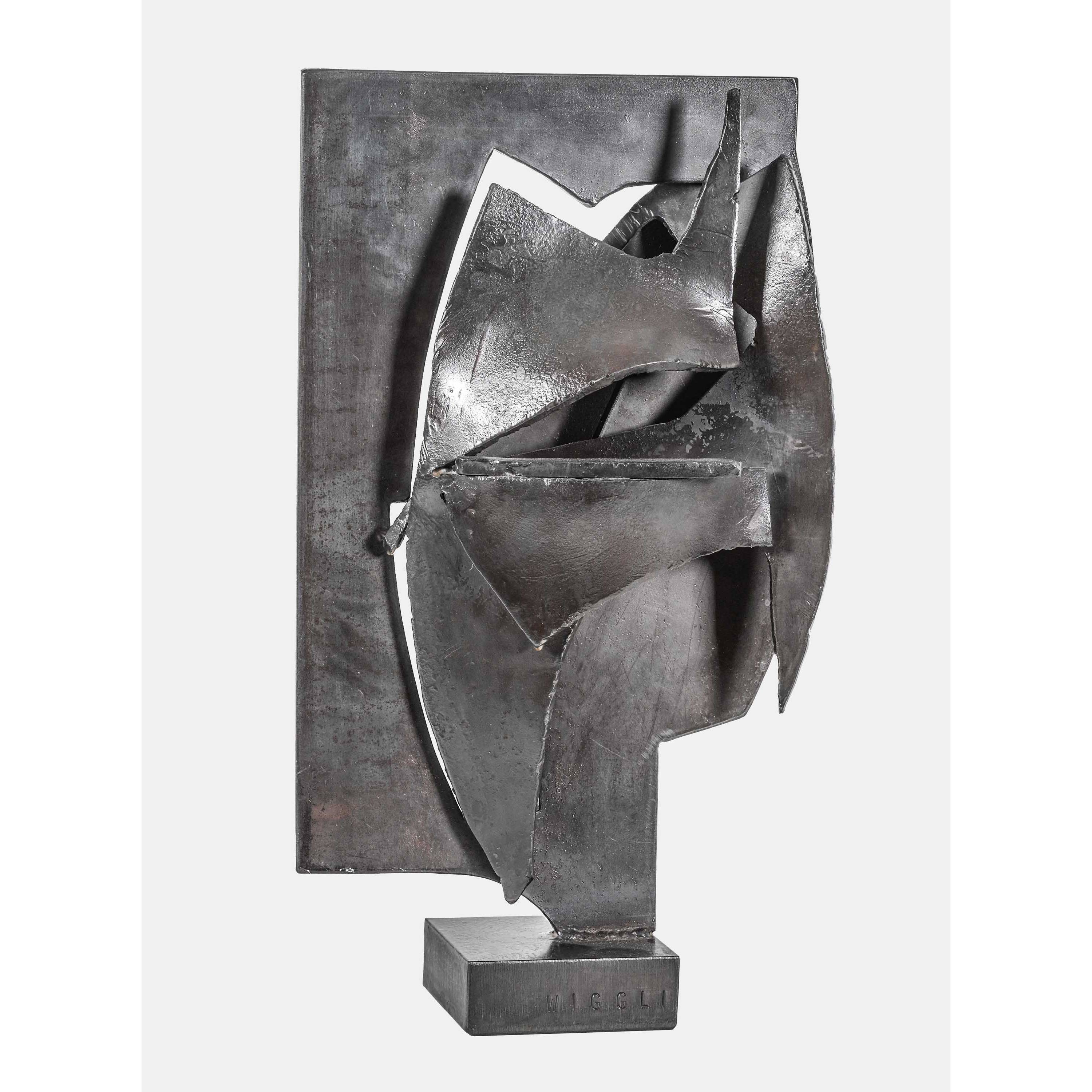 Oscar Wigglis abstrakte Eisenplastiken deuten - trotz reduziertem Formenvokabular - mit ihrer organischen Körperlichkeit den weiblichen Torso an. Die Bearbeitung und Verformung des Werkstoffes Eisen mittels verschiedener mechanischer und hydraulischer Hammerwerkzeuge führt zu einer Verlebendigung des Materials mit hautartig gespannter Oberfläche. Hierbei entsteht eine Synthese aus künstlerischer Arbeit und grossindustriellen Produktionsbedingungen. Das angebotene Objekt besticht durch das Spannungsverhältnis zwischen starren Partien und fliessenden Wölbungen.