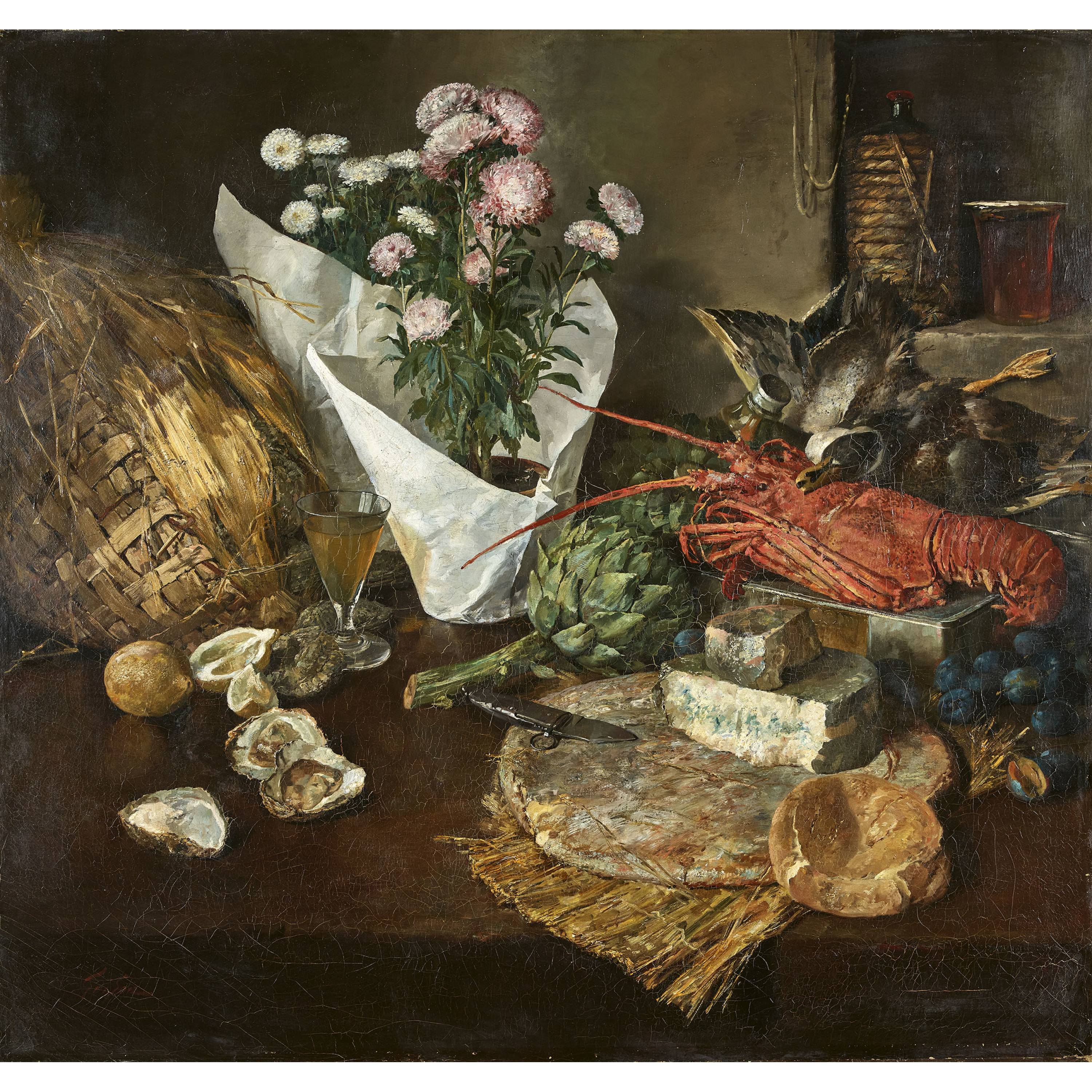 Tischstillleben mit Austern, Schimmelkäse, Languste Artischocken, Federvieh und Chrysanthemen.
