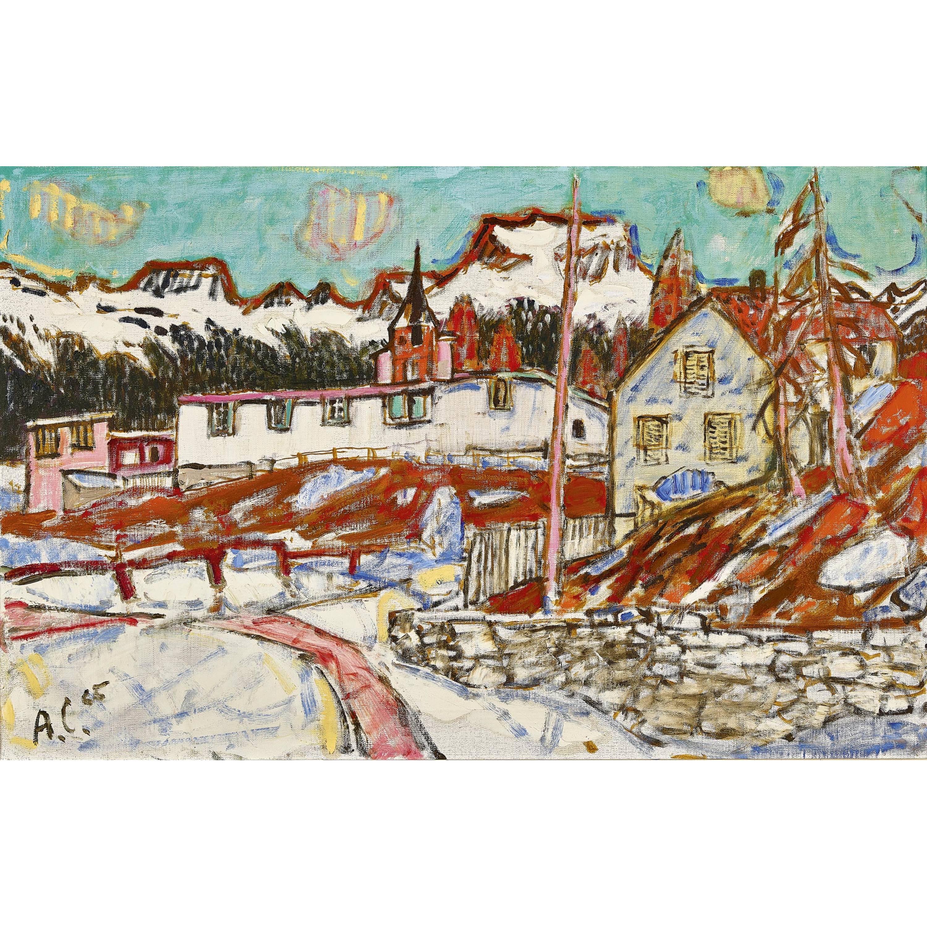 Das vorliegende Gemälde lenkt den Blick von Silvaplana bzw. Champfèr auf den Piz de la Margna. Markant erhebt sich die Silhouette des Bergmassives über dem Dorf, was durch die ausgeprägten rotbraunen Konturen und den Hell-Dunkel-Kontrast im unteren Bildteil zusätzlich gesteigert wird. Das Häusergefüge führte Carigiet in kräftigen Farben und mit ausdrucksstarker Pinselführung aus. Wenngleich die Farbe an einigen Stellen pastos aufgetragen wurde, so erscheint sie doch mehrheitlich in sehr dünner Platzierung, was zum - durchaus reizvollen - Miteinbezug der durchscheinenden Leinwandstruktur als bildnerischem Mittel führte. Die Komposition profitiert ausserdem von der langjährigen Erfahrung des Bündner Malers im Umgang mit druckgrafischen Arbeiten.