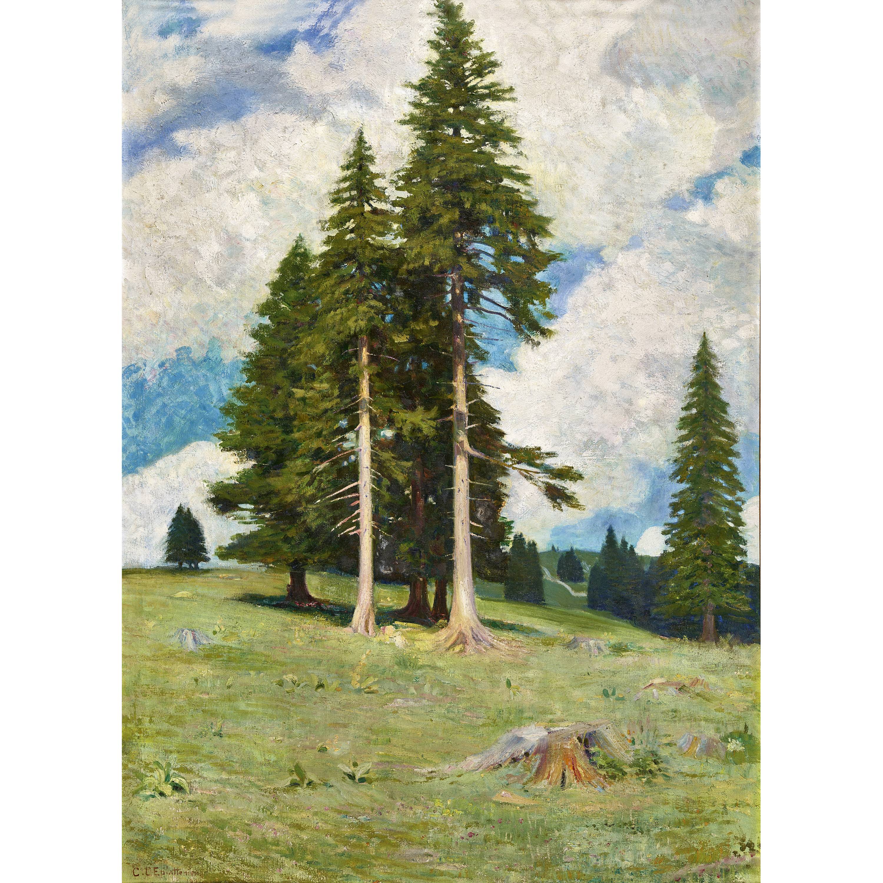 Mit seinen bevorzugt an den Hügelzügen des Jura und am Flusslauf des Doubs entstandenen Landschaftsgemälden leistete Charles L'Eplattenier seinen künstlerischen Beitrag am Übergang zwischen Jugendstil und Moderne. Die angebotene Komposition - eine mit vereinzelten Tannengruppen durchsetzte Juralandschaft unter Wolkenhimmel - zeugt denn auch von der zeichnerischen Einfachheit und malerischen Dichte, wie sie für L'Eplatteniers Schaffen typisch sind.