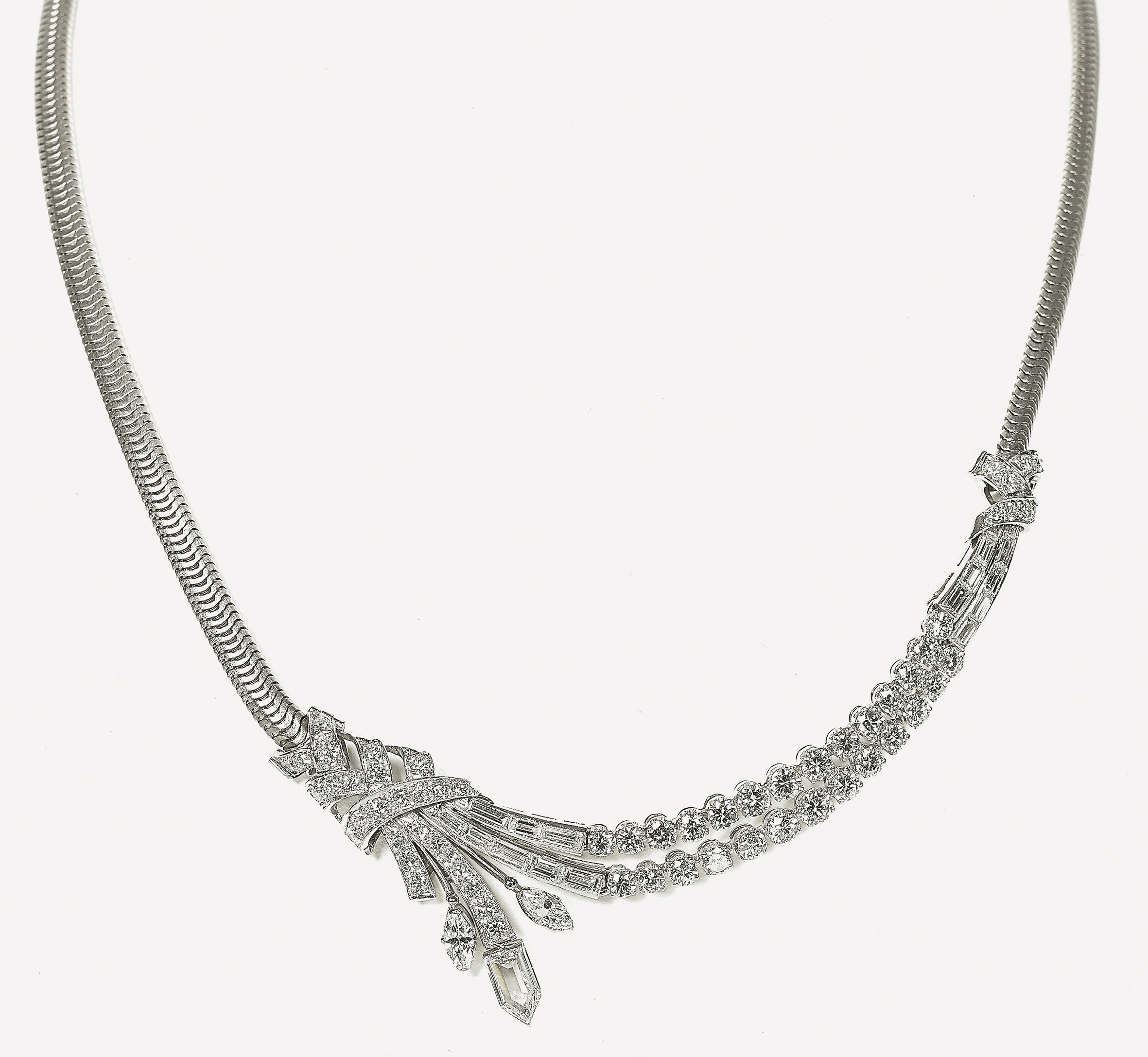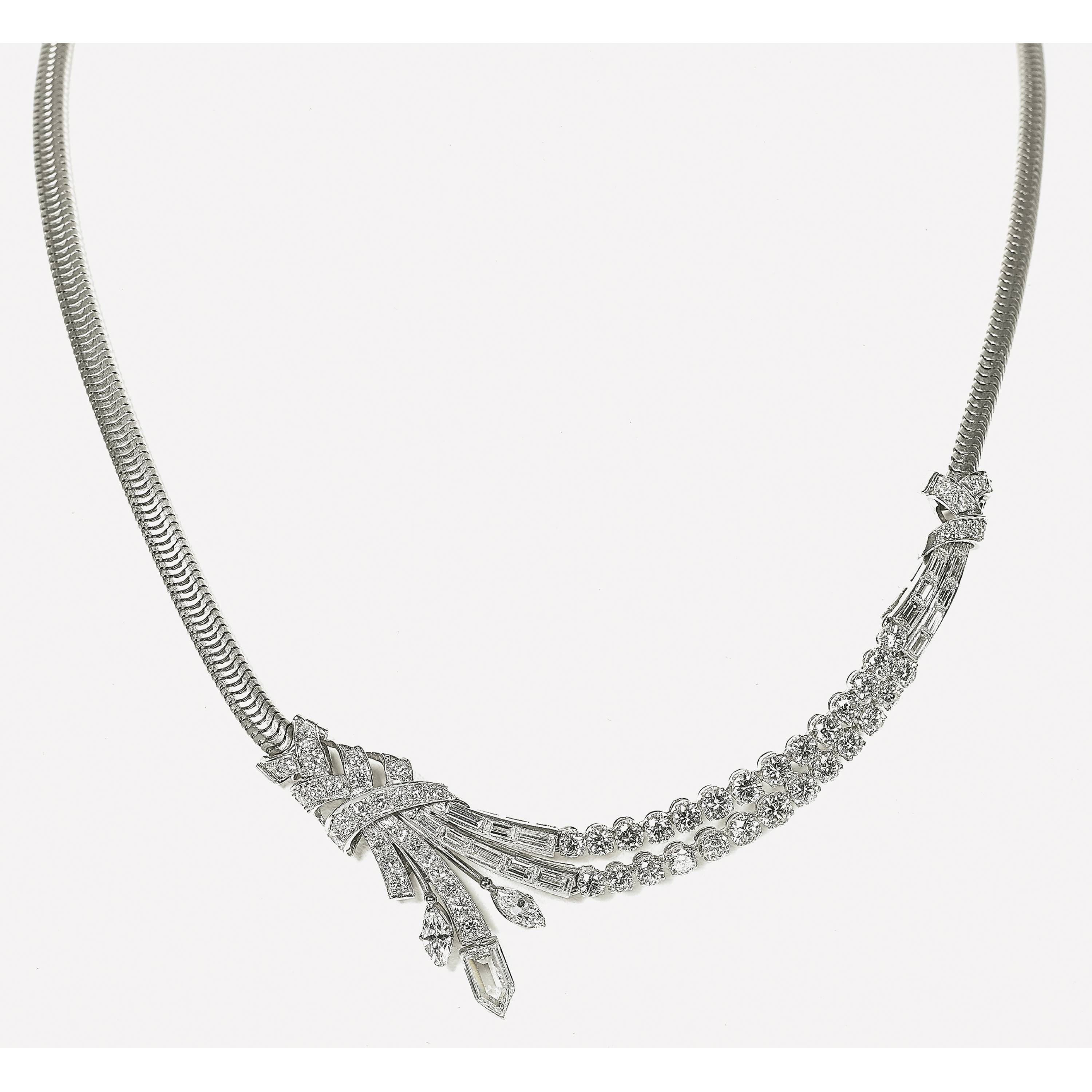 Raffinierte Arbeit aus Palladium, die sowohl als Collier als auch als Brosche getragen werden kann. Die geschwungene Schauseite belegt mit 1 schildförmigen Diamanten, 2 Diamant-Navetten, 15 Diamant-Baguetten, 56 Brillanten und 7 Achtkant-Diamanten von zus. ca. 6,00 ct. (um E/F/G, VVS-SI). Mit rückseitiger Gravur "Christoph-Conrad 5. Juli 1950". Mit Fischgrat-Kette aus Palladium und Ziehbroschierung aus Weissgold 18 kt. Punziert "Gübelin" (Nr. 196317). 2,5x9 cm (Anhänger), 3x8,5 cm (Broschierung), L: 33 cm (Kette ohne Anhänger), zus. ca. 40,7 g