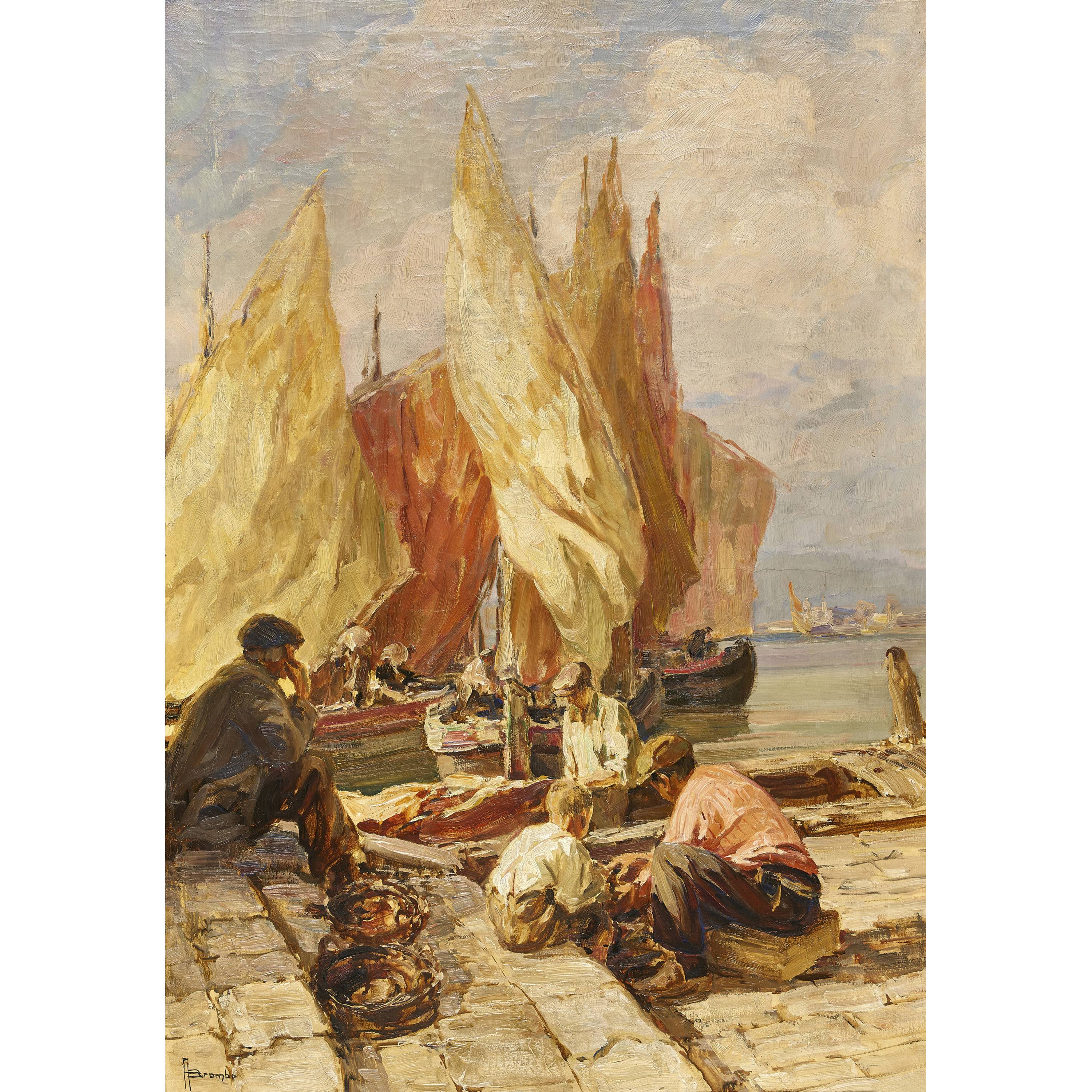 Sitzende Fischer am Ufer.