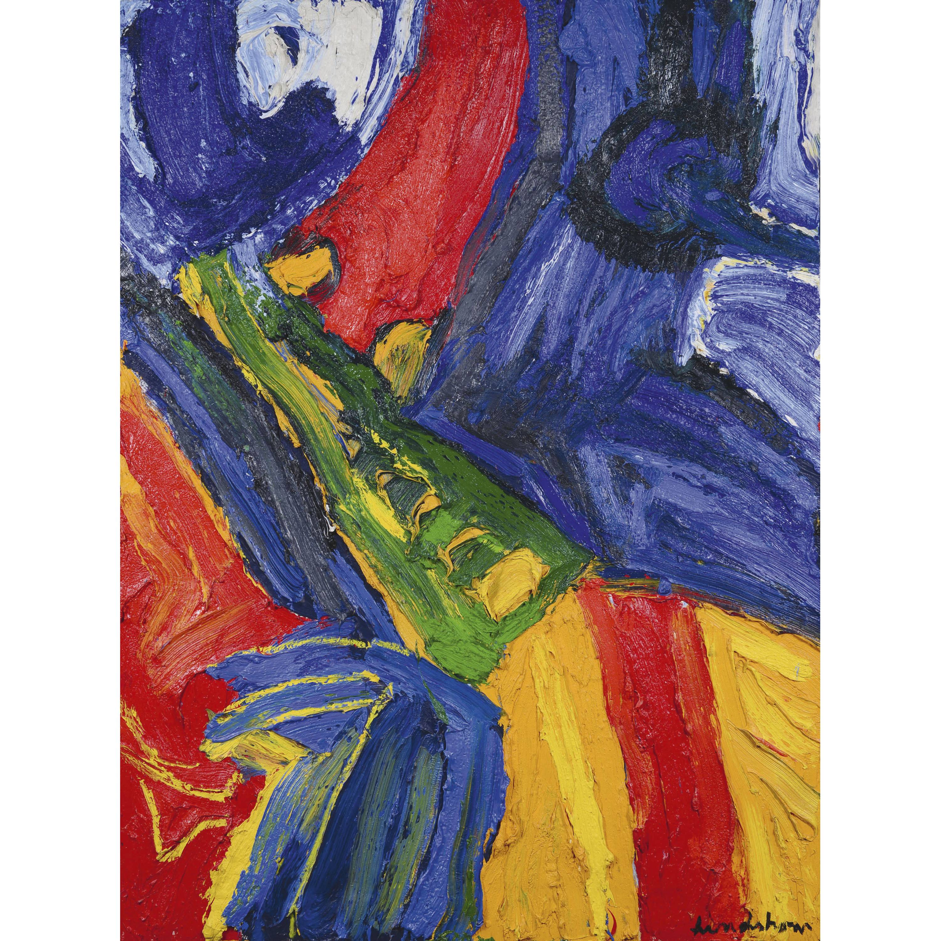 The composition "Le barbare", painted in 1990, is a part of Bengt Lindström's late work. In impasto and massive brushstrokes, it presents yellow, red, green and blue areas of color that are harshly contrasted. Only on a closer look, one can recognize a grotesque visage with a round pair of eyes and a curved nose, slightly tilted to the right.