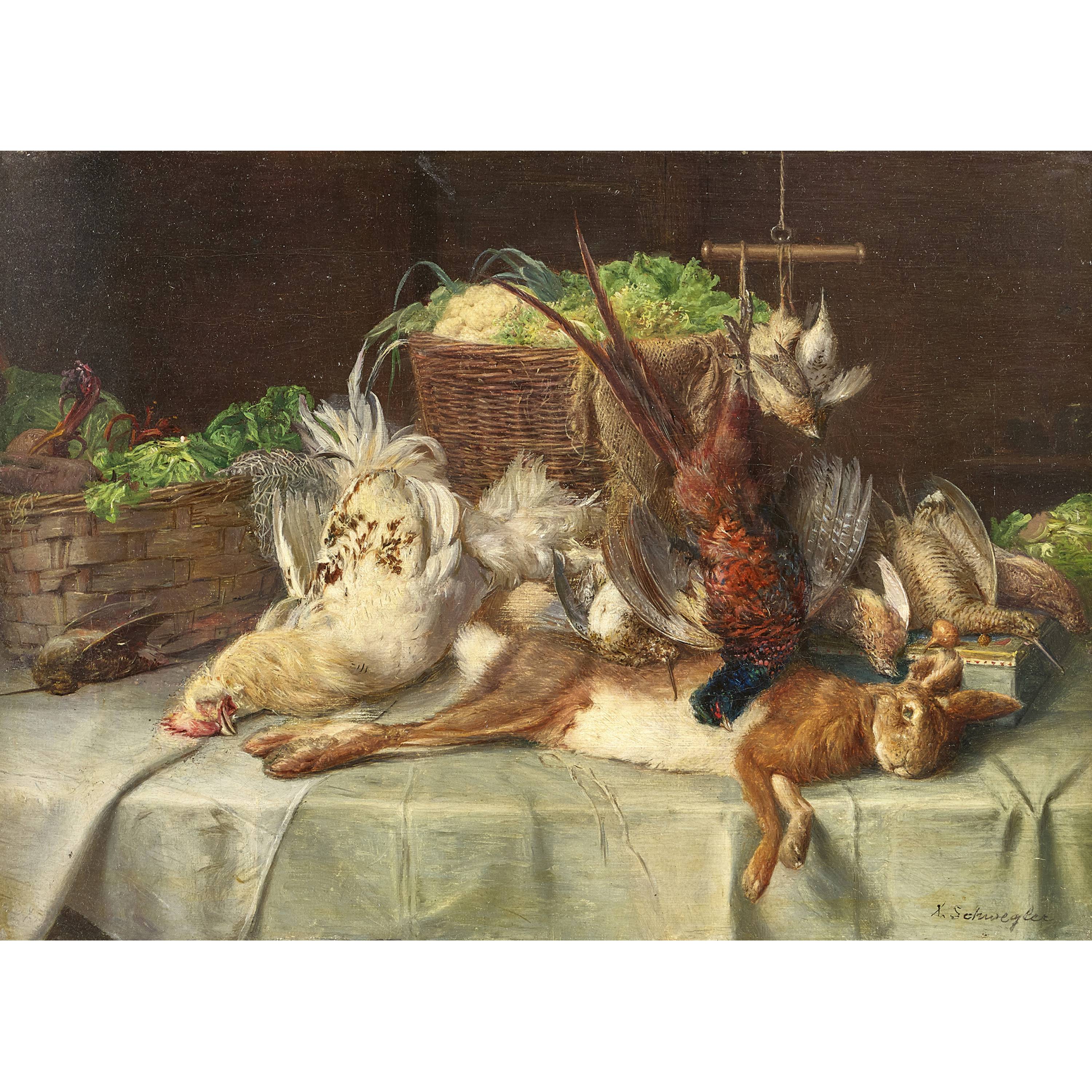 Küchenstillleben mit Gemüsekörben und erlegtem Kleinvieh.