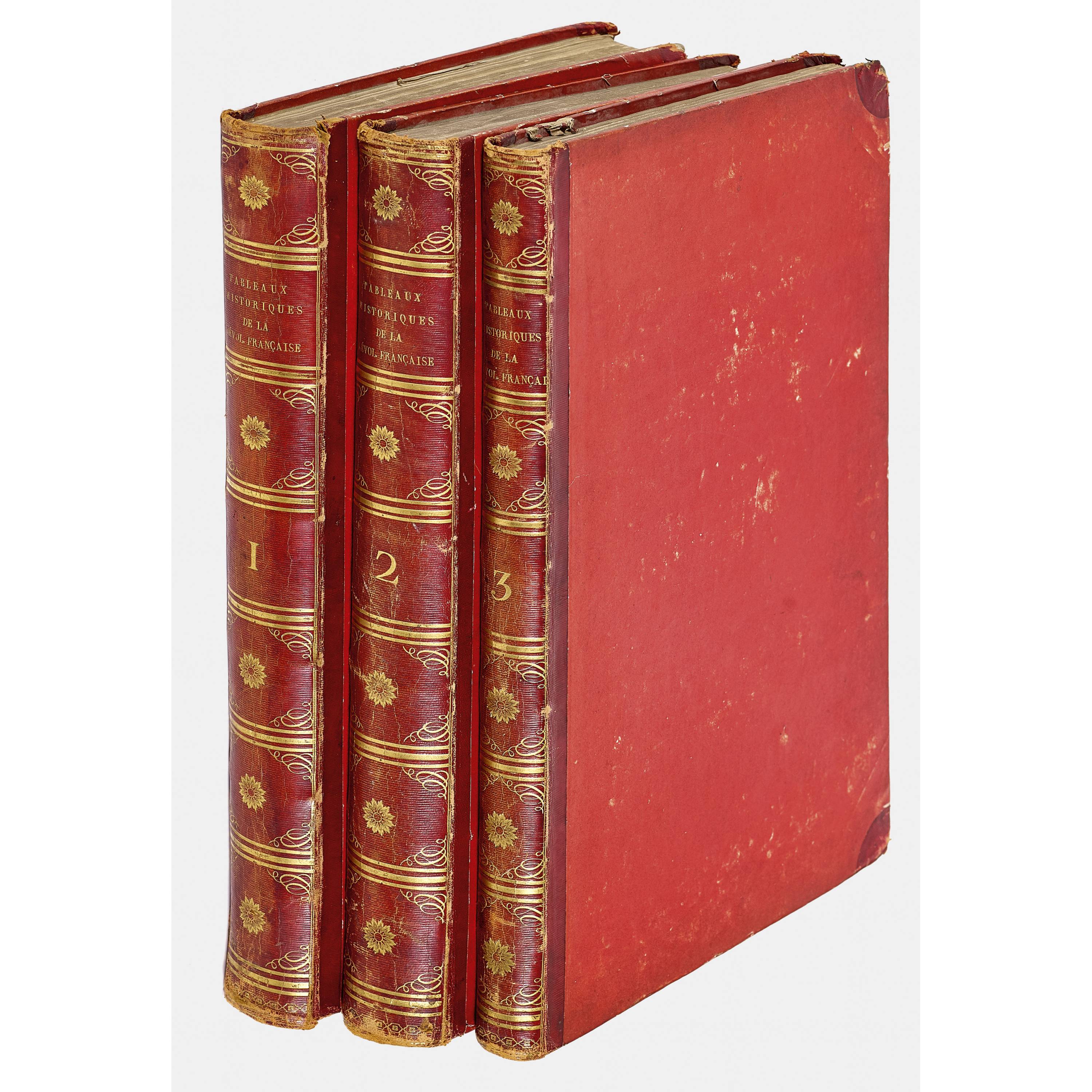 Didot für Aubert, Paris 1804. 3 Bde. In französischer Sprache. Mit 3 gestochenen Frontispizen und 219 Kupferstichtafeln nach Jean Duplessis-Bertaux, Abraham Girardet, Nicolas Ozanne, Jean-Louis Prieur, Jacques François Joseph Swebach-Desfontaines und Vény, gestochen von Pierre-Gabriel Berthault, Jean Desaulx, Claude-Nicolas Malapeau und Claude Niquet. Rote Halbmaroquin-Einbände mit golgeprägten Rückentiteln, Gr.-Folio