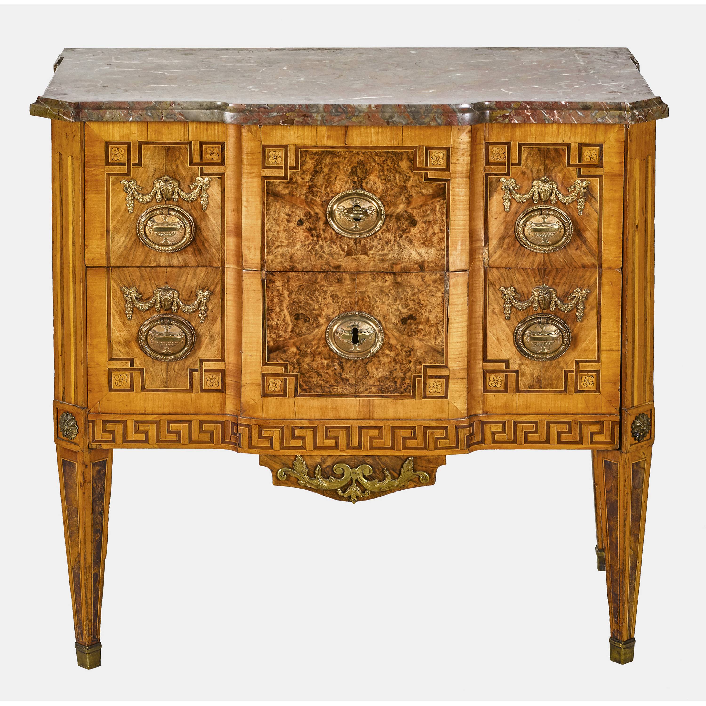 Kirsche, Nussbaum und Nussbaummaser, furniert. Korpus mit vorderen geschrägten Ecklisenen auf Pyramidenfüssen, zwei Schubladen "sans traverse" und vorspringendem Mittelrisalit. Front und Seiten sind gegliedert durch Flöten, Mäander und die Maserfelder umlaufende Zierbänder mit Eckschlaufen. Beschläge "en laiton repoussé" sowie randprofiliertes, rötlichgraues Marmorblatt dem Verlauf der Schauseite folgend.
