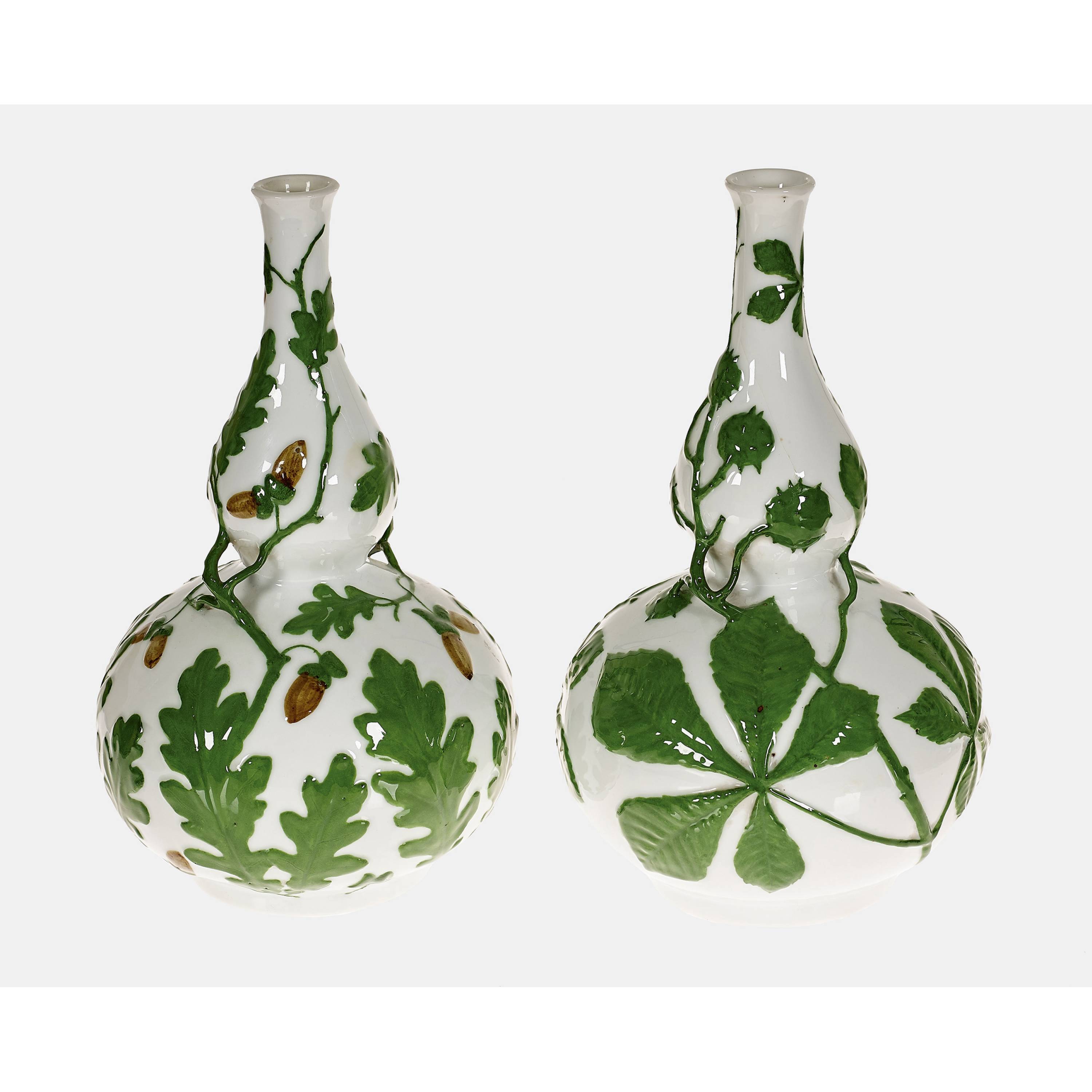 Je gedrückter Kugelkorpus mit abgesetztem Hals. Umlaufend plastischer Dekor aus Eichen- und Kastanienlaub mit Früchten.