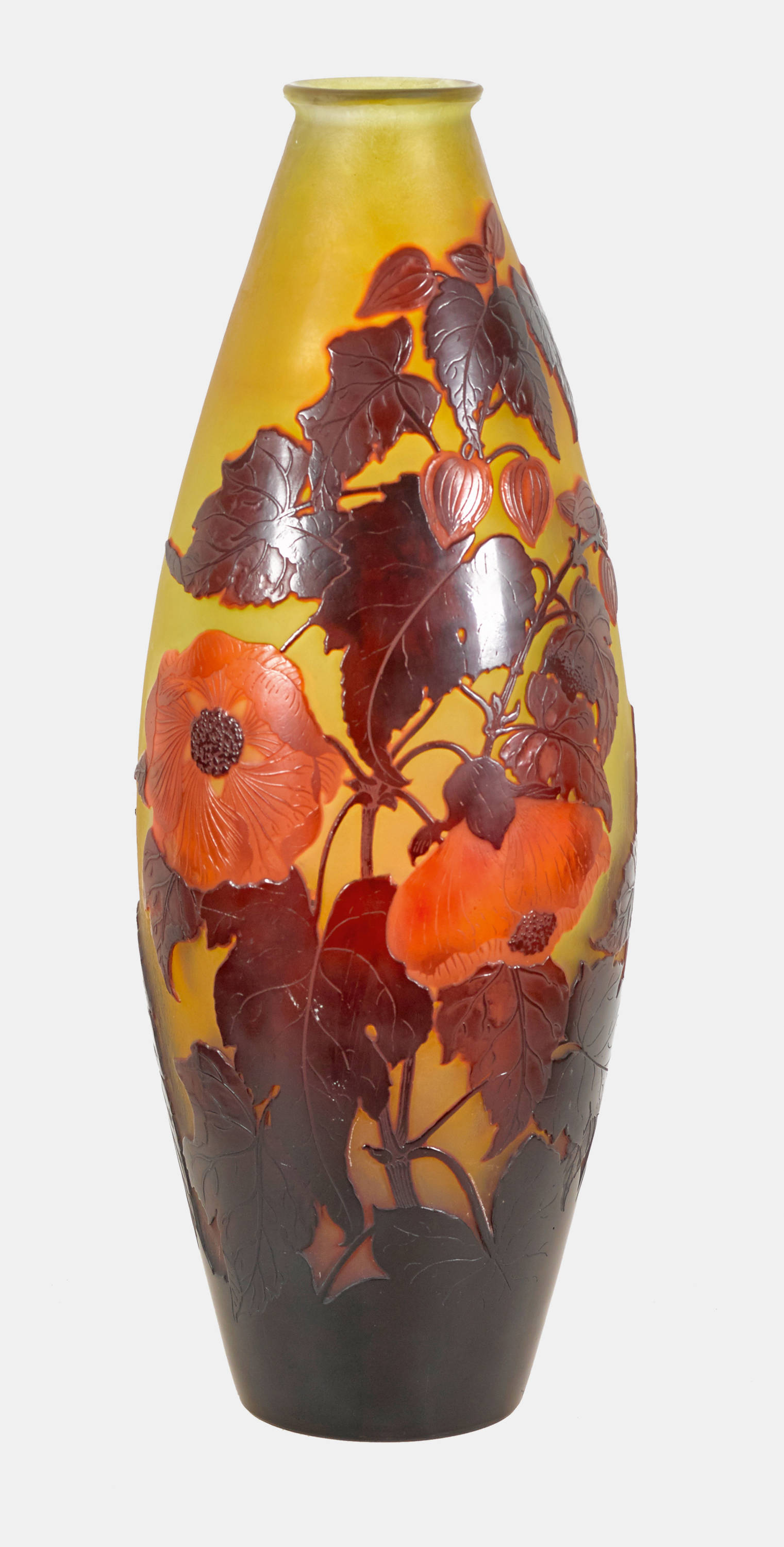 Opakes Glas mit gelben Pulvereinschmelzungen, hellrot und weinrot überfangen und geätzt, Binnenzeichnung in feiner Hoch- und Nadelätzung, a. Wandung erhaben bez. "Gallé",