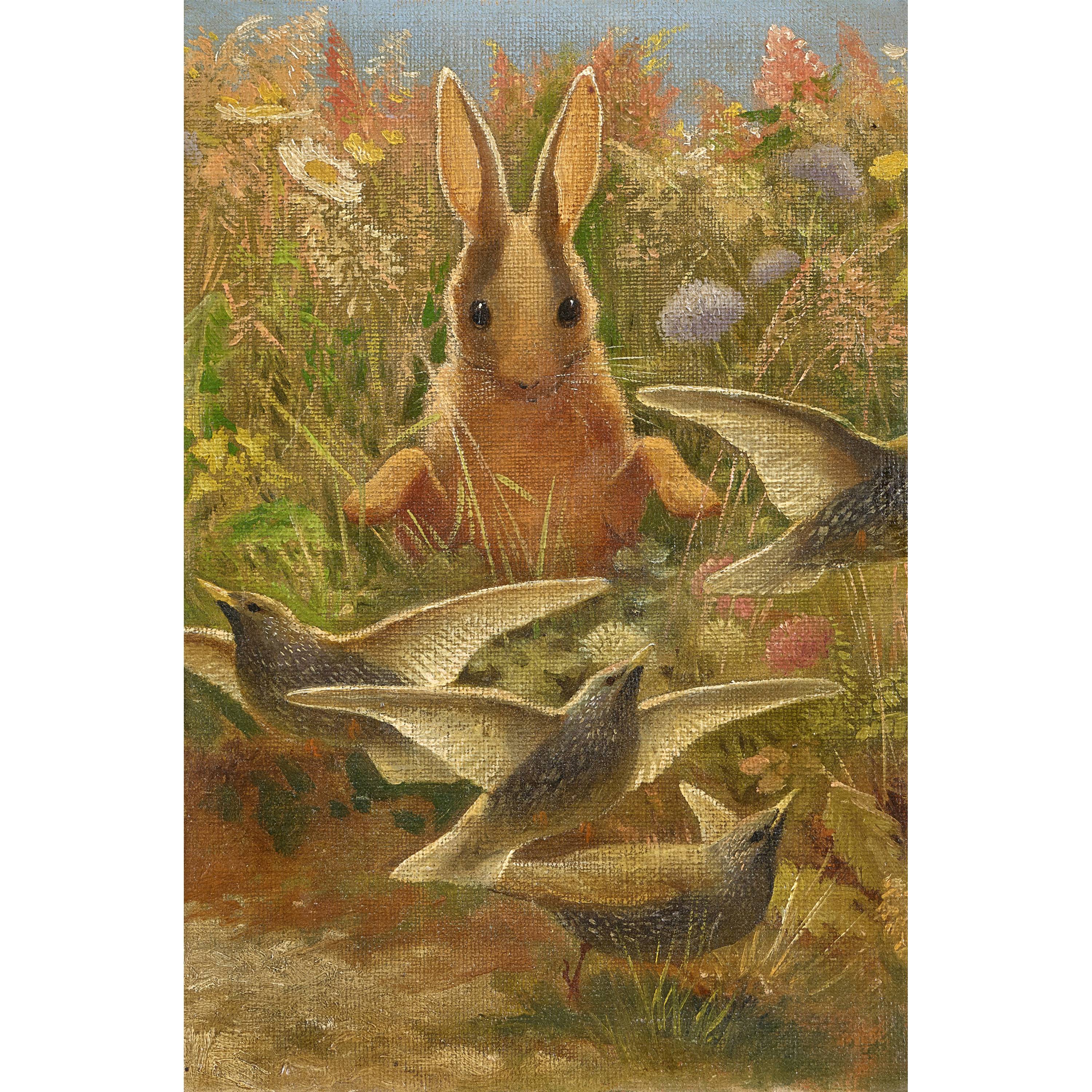 Kaninchen und Vögel auf einer Wiese.