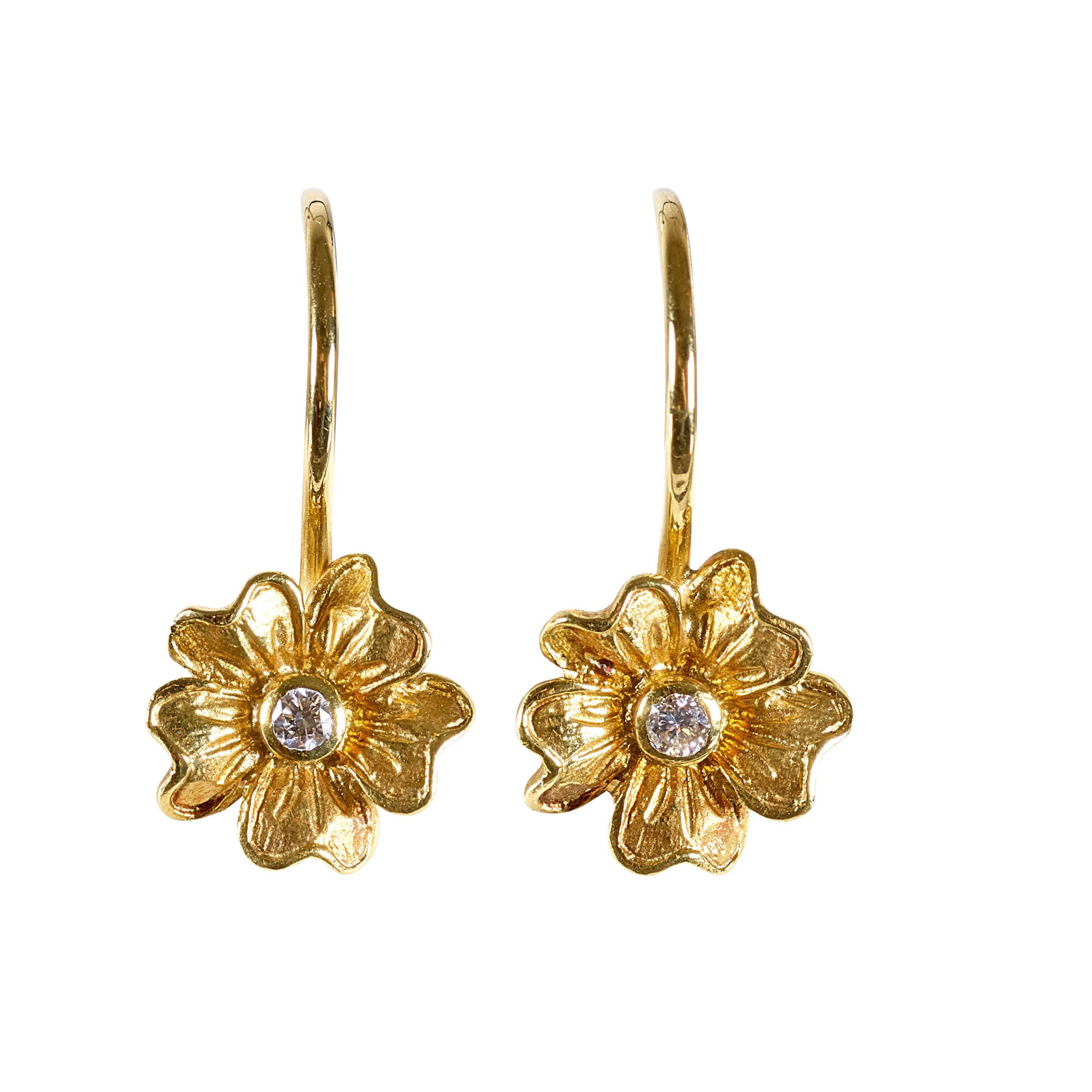 Graziles Paar in Gelbgold 18 kt. mit Clipbrisur. Die blumenförmige Schauseite mit je 1 zentralen Brillanten in Zargenfassung. Je H: 2 cm, zus. ca. 4,5 g