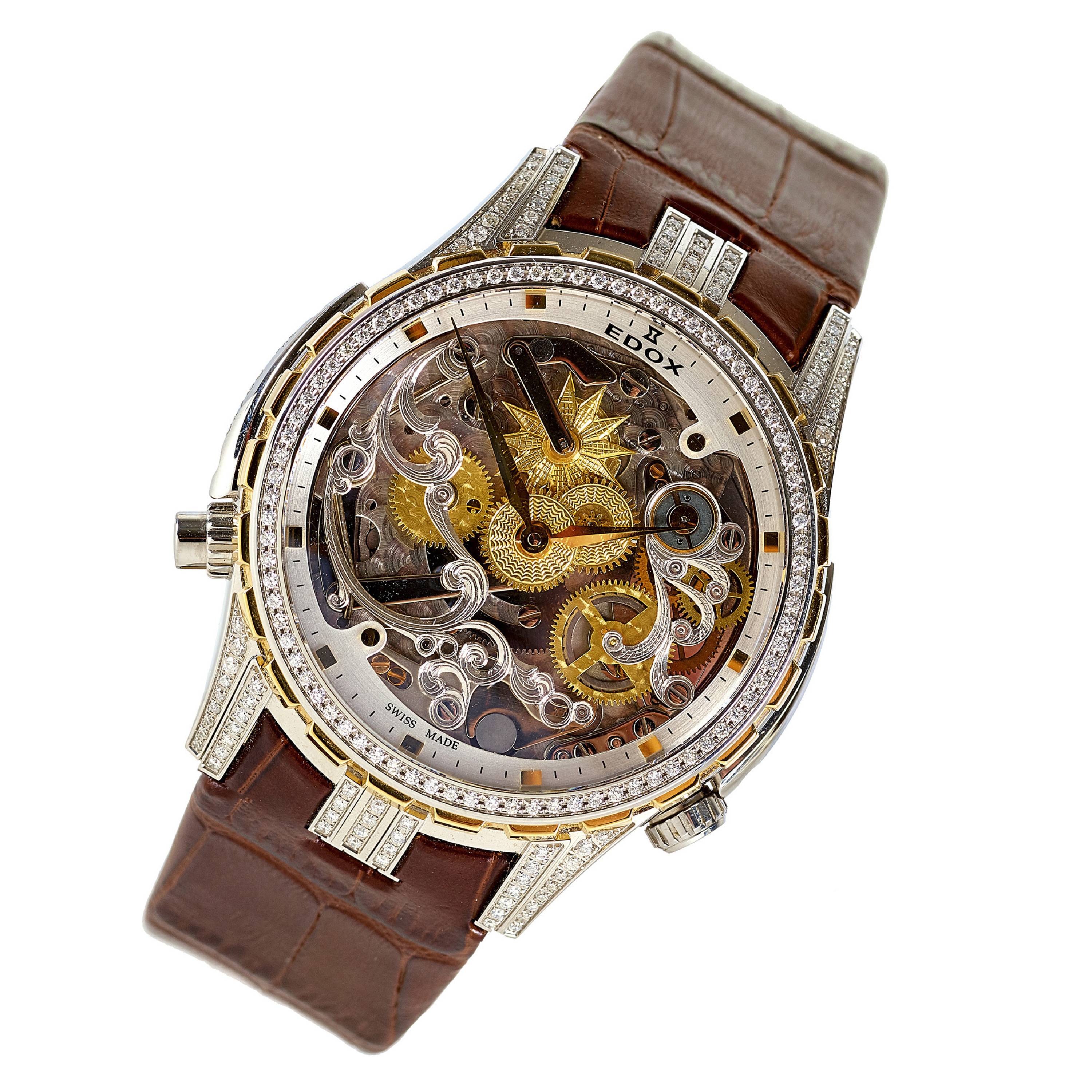 Manufaktur: Edox, Les Genevez. Modell: "Grand Ocean Cape Horn 5 Minute Repeater", limited Edition, No. 03/10. Jahr: Um 2010. Referenz-Nr.: 87003 318D1 AID. Serien-Nr.: 575305. Kaliber: Edox 87, ETA 2892-A2 mit Dubois-Dépraz Komplikation, Automatik. Gehäuse-Nr.: 87003. Material: Stahl, Gelbgold 18 kt. und Diamanten. Armband: Braunes Edox-Lederarmband in Krokodilleder-Optik. Verschluss: Edox-Doppelfaltschliesse aus Stahl. Grösse: ø 45 mm, L: 195 mm (Armband). Zubehör: Originalbox, Zertifikat, Diamant-Zertifikat, Internationale Garantiekarte, Booklet, Hängeetikett.