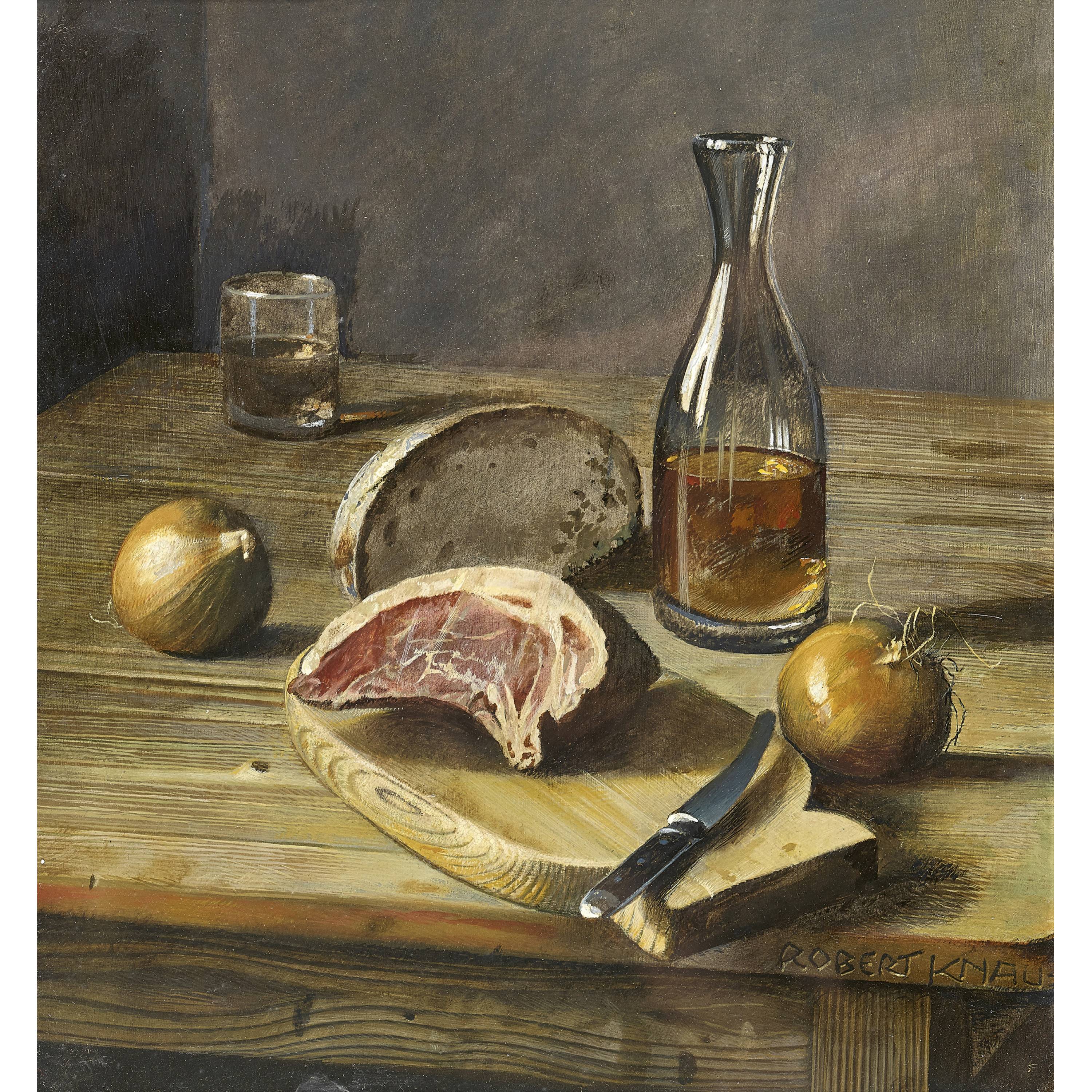 Stillleben mit Brot, Schinken, Zwiebeln und Karaffe.