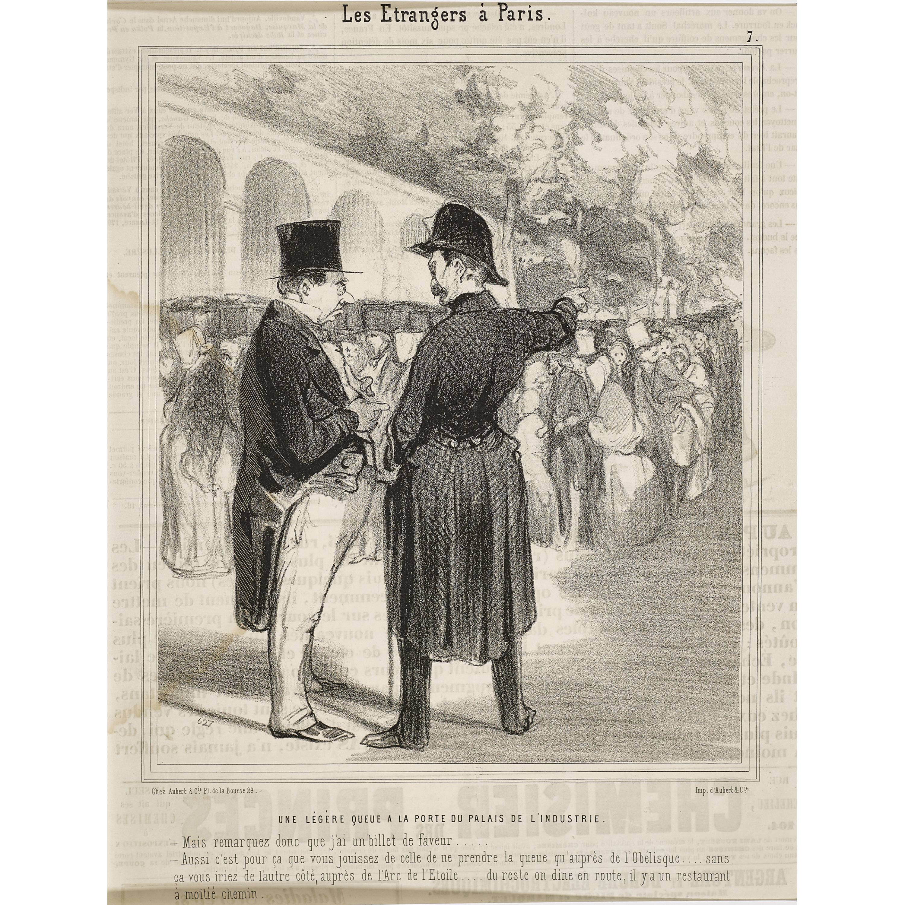 42 Blätter, zumeist aus "Le Charivari", auf Zeitungspapier mit typografischem Text verso. Aus den Folgen: 1. "Types parisiens" (14 Blätter), Nrn. 3, 7-8, 15, 18, 23, 25, 31, 35 (Doublette), 38, 42, 43, 45. Erschienen in "Le Charivari" zwischen September und November 1841 bzw. im Album "Types Parisiens" zwischen 1839 und 1841 (Delteil D.502, D.561, D.565, D.566, D.574, D.579, D.581, D.587, D.581, D.594, D.598, D.599, D.601). 2. "Émotions parisiennes" (11 Blätter), Nrn. 2, 5, 6, 7, 11, 15, 23, 29, 32 (Doublette), 47. Erschienen in "Le Charivari" zwischen Oktober 1839 und Oktober 1842 bzw. im Album "Émotions Parisiennes", 1842 (D.685, D.688, D.689, D.690, D.695, D.699, D.707, D.713, D.716, D.725). 3. "Les étrangers à Paris" (6 Blätter), Nrn. 4, 7, 12, 13 (Doublette), 15. Erschienen in "Le Charivari" zwischen Juni und August 1844 (D.1275, D.1278, D.1283, D.1284, D.1286). 4. "La journée du célibataire" (11 Blätter), Nrn. 1-8, 9 (Doublette), 11. Erschienen in "Le Charivari" zwischen April und September 1839 bzw. im Album "La Journée du Célibataire", 1839 (D.607, D.608, D.609, D.610, D.611, D.612, D.613, D.614, D.615, D.617).