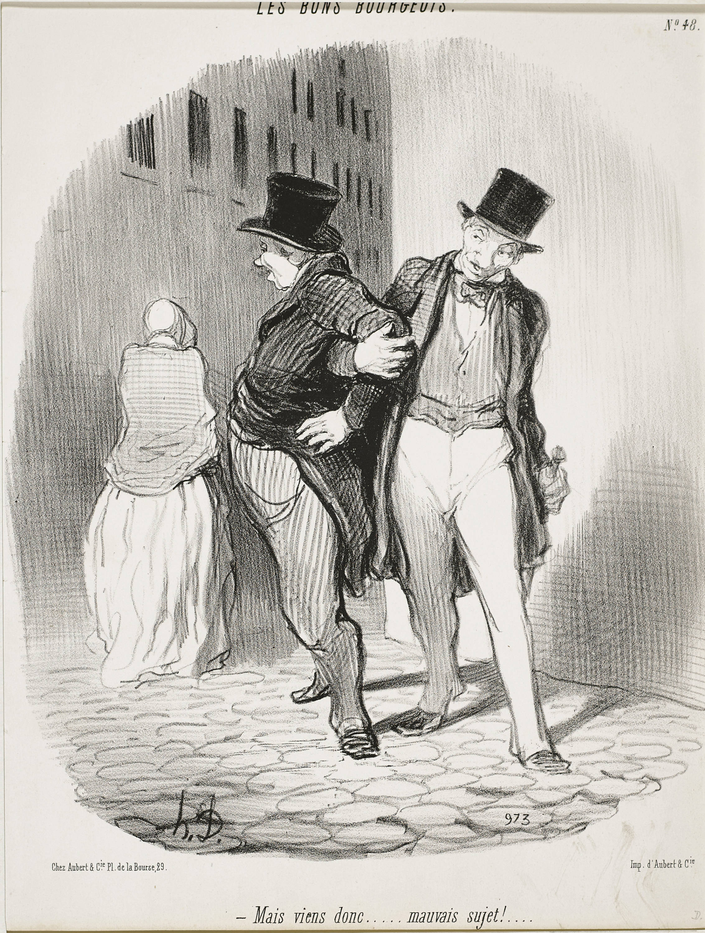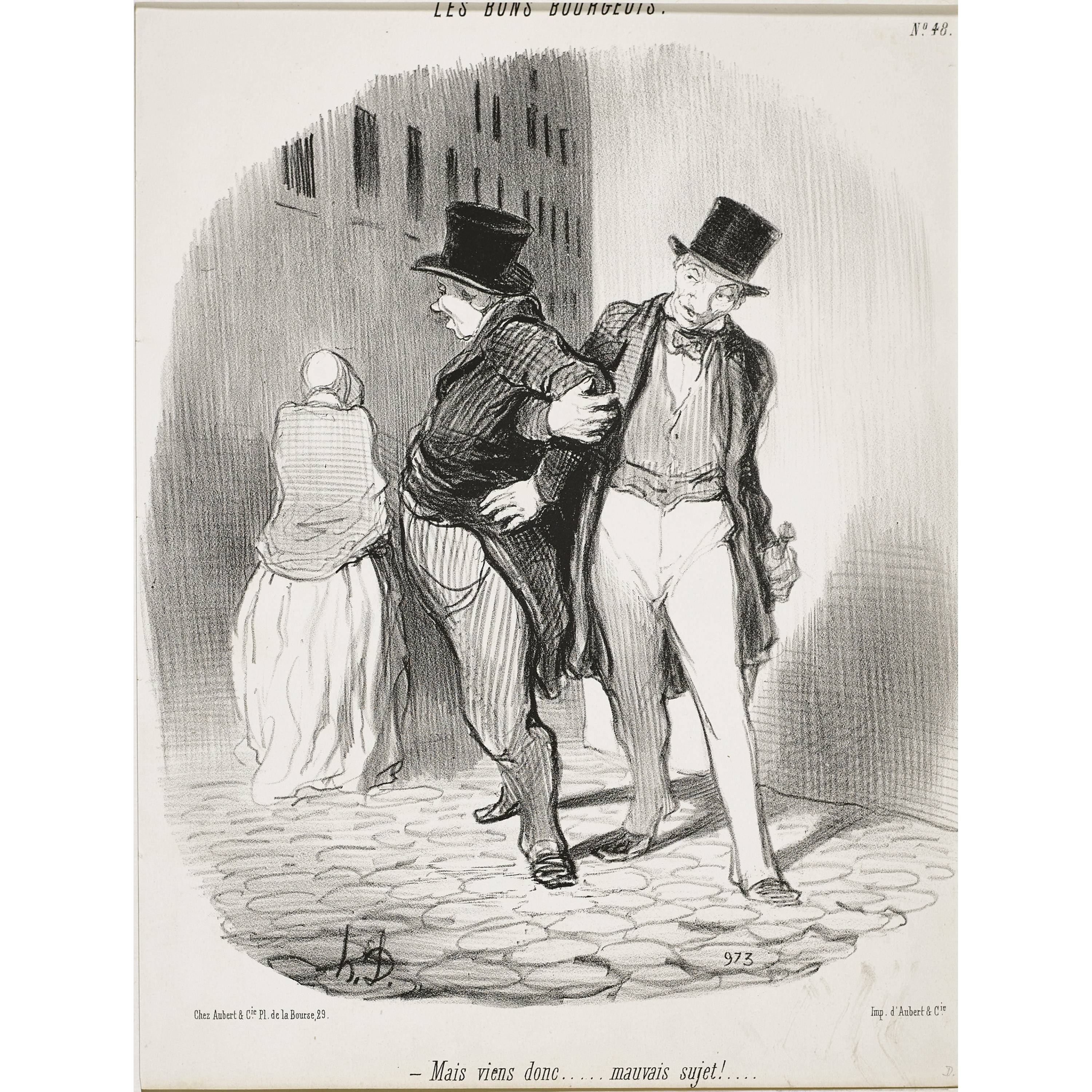 42 Blätter, zumeist aus "Le Charivari", auf Zeitungspapier mit typografischem Text verso. Aus den Folgen: 1. "Les bons bourgeois" (21 Blätter), Nrn. 2, 3, 7 (Doublette), 9 (Doublette), 14 (Doublette), 16 (Doublette), 18, 36, 38, 46, 48, 51, 54, 62, 72, 75, 76. Erschienen in "Le Charivari" zwischen Mai 1846 und November 1847 bzw. im Album "Les bons Bourgeois", 1847 (Delteil D.1478, D.1479, D.1483, D.1485, D.1490, D.1492, D.1494, D.1512, D.1514, D.1522, D.1524, D.1527, D.1530, D.1538, D.1548, D.1551, D.1552). 2. "Professeurs et moutards" (13 Blätter), Nrn. 10, 12-15, 19, 24-29, 31. Erschienen in "Le Charivari" zwischen Januar 1846 und Juni 1846 bzw. im Album "Professeurs et Moutards", 1846 (D.1447, D.1449, D.1450, D.1451, D.1452, D.1456, D.1461, D.1462, D.1463, D.1464, D.1465, D.1466, D.1468). 3. "Les alarmistes et les alarmés" (4 Blätter), Nrn. 4-7. Erschienen in "Le Charivari" zwischen Mai 1848 und Juni 1848 (D.1764, D.1765, D.1766, D.1767). 4. "Les représentants représentés" (4 Blätter), Nrn. 3, 11, 28, 41. Erschienen in "Le Charivari" zwischen Dezember 1848 und Mai 1849 (D.1801, D.1809, D.1826, D.1839).