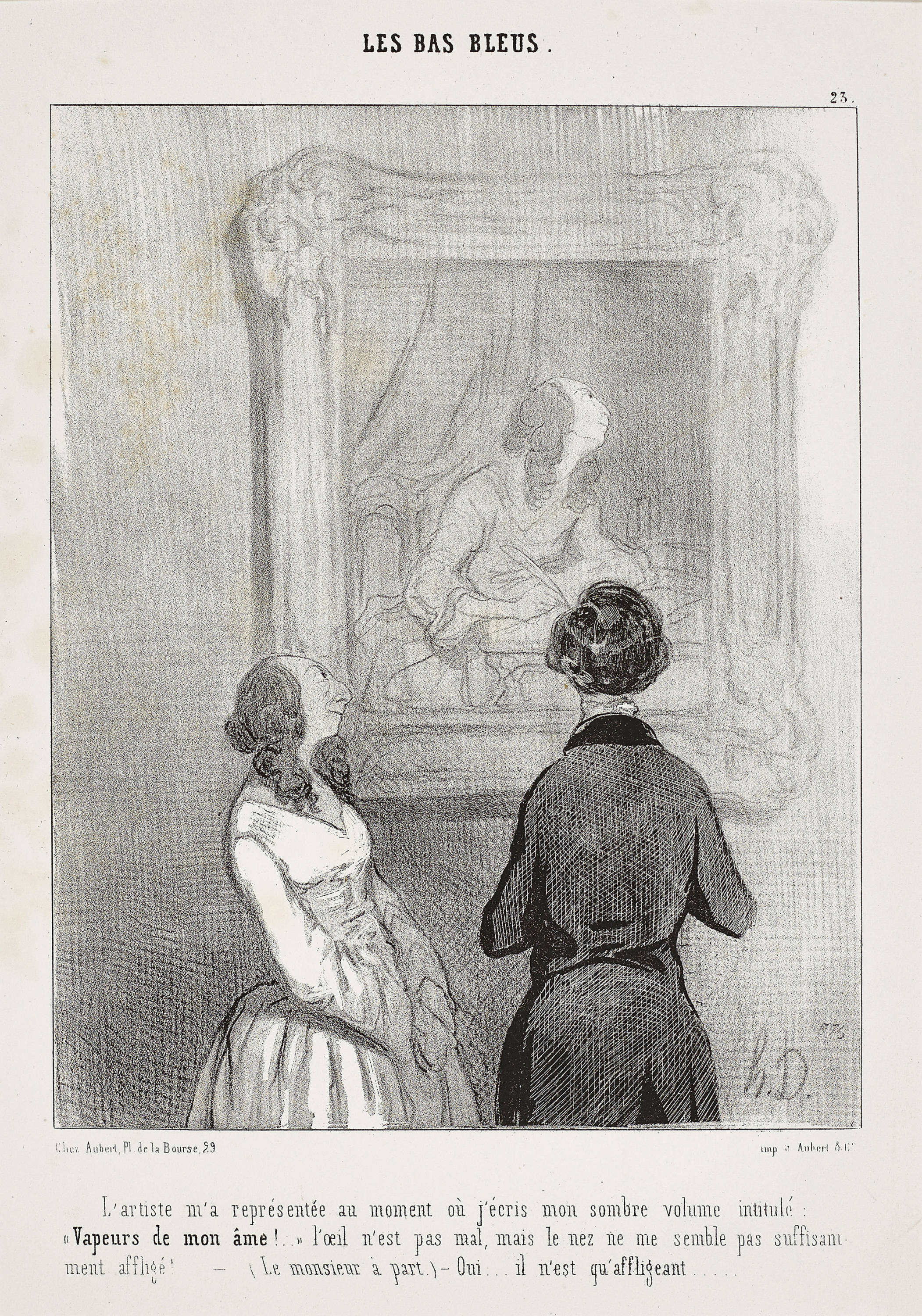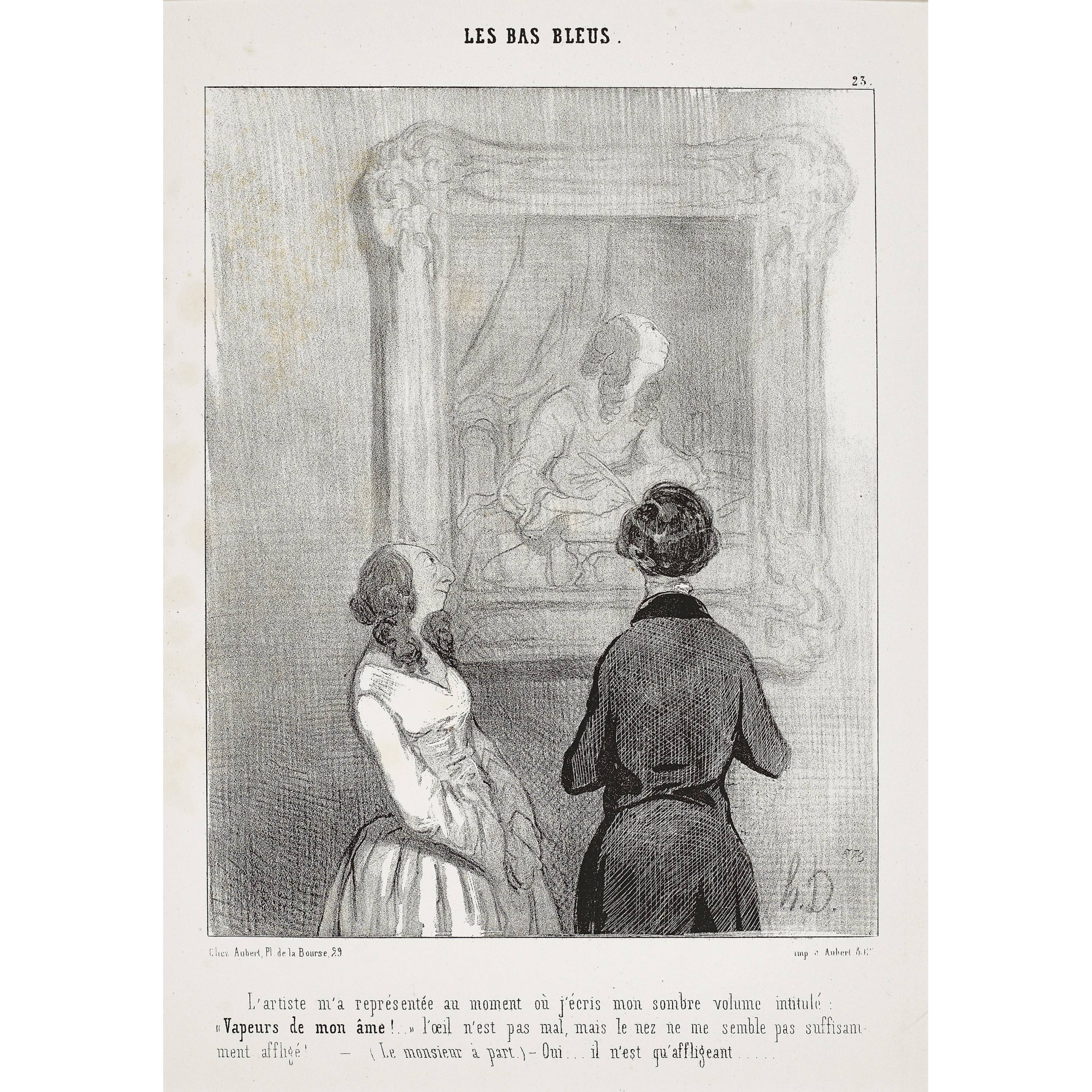 40 Blätter, zumeist aus "Le Charivari", auf Zeitungspapier mit typografischem Text verso. Aus den Folgen: 1. "Les beaux jours de la vie" (19 Blätter), Nrn. 3, 6, 7, 11, 15, 17, 40, 45, 47, 50, 54 (Doublette), 59, 74, 80, 86, 87, 89, 96. Erschienen in "Le Charivari" zwischen Januar 1844 und Juli 1846 bzw. im Album "Les beaux jours de la vie" 1843-1846 (Delteil D.1090, D.1093, D.1094, D.1098, D.1102, D.1104, D.1127, D.1132, D.1134, D.1137, D.1141, D.1147, D.1162, D.1168, D.1174, D.1175, D.1177, D.1184). 2. "Les bas-bleus" (13 Blätter), Nrn. 3, 4, 8, 13, 19, 21, 22, 23 (Doublette), 30, 31, 38, 40. Erschienen in "Le Charivari" zwischen Februar und August 1844 bzw. im Album "Les bas-bleus" 1844 (D.1223, D.1224, D.1228, D.1233, D.1239, D.1241, D.1242, D.1243, D.1250, D.1251, D.1258, D.1260). 3. "Paris l'hiver/Paris l'été" (5 Blätter), Nrn. 1, 4, unnum., bzw. 1, 3. Erschienen in "Le Charivari" zwischen Dezember 1844 und Januar 1845 bzw. in "Le Journal Amusant", Februar 1865, bzw. in "Le Charivari" zwischen Mai 1852 und August 1854 (D.1329, D.1332, D.3362 bzw. D.2306, D.2589) 4. "Cours d'histoire naturelle" (3 Blätter), Nrn. 1, 7, 10. Erschienen in "Le Charivari" im März 1838 (D.523, D.529, D.532).