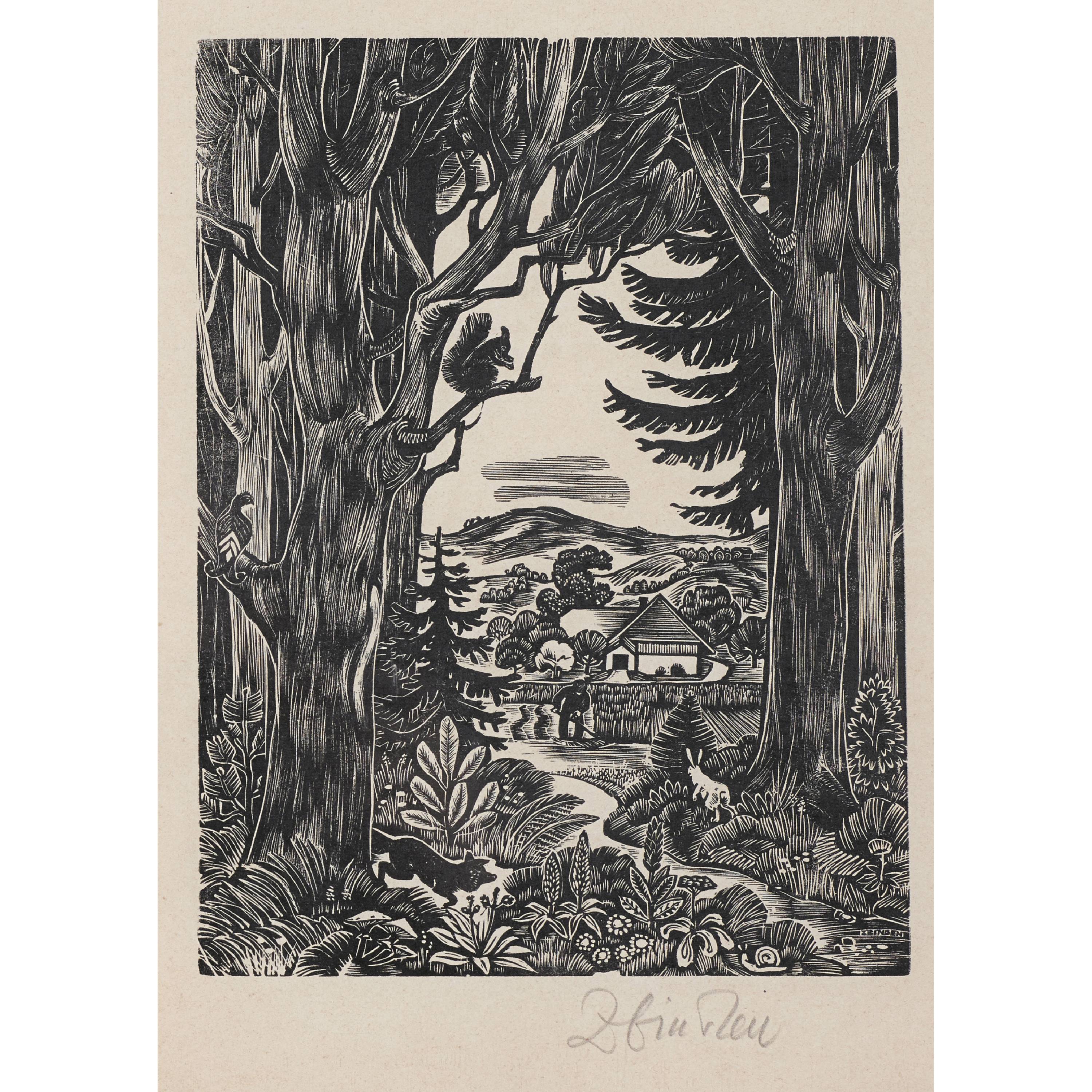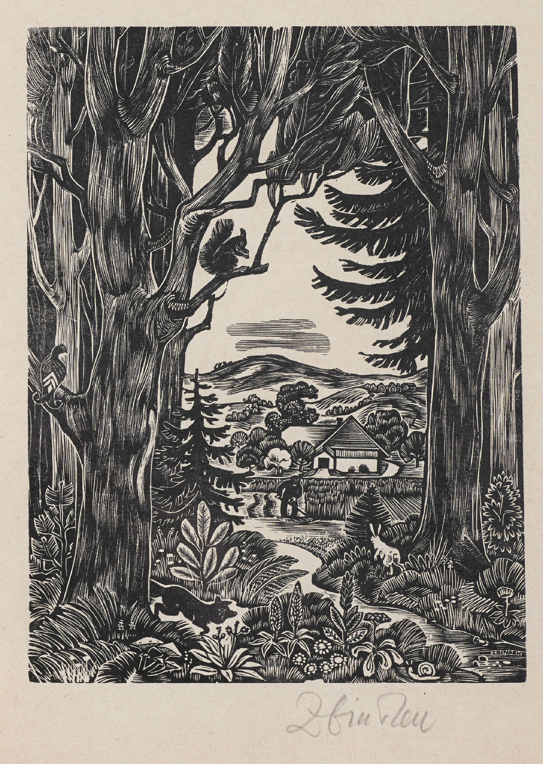 2 Blätter: 1. "Wald". 2. Verschneiter Weiler.