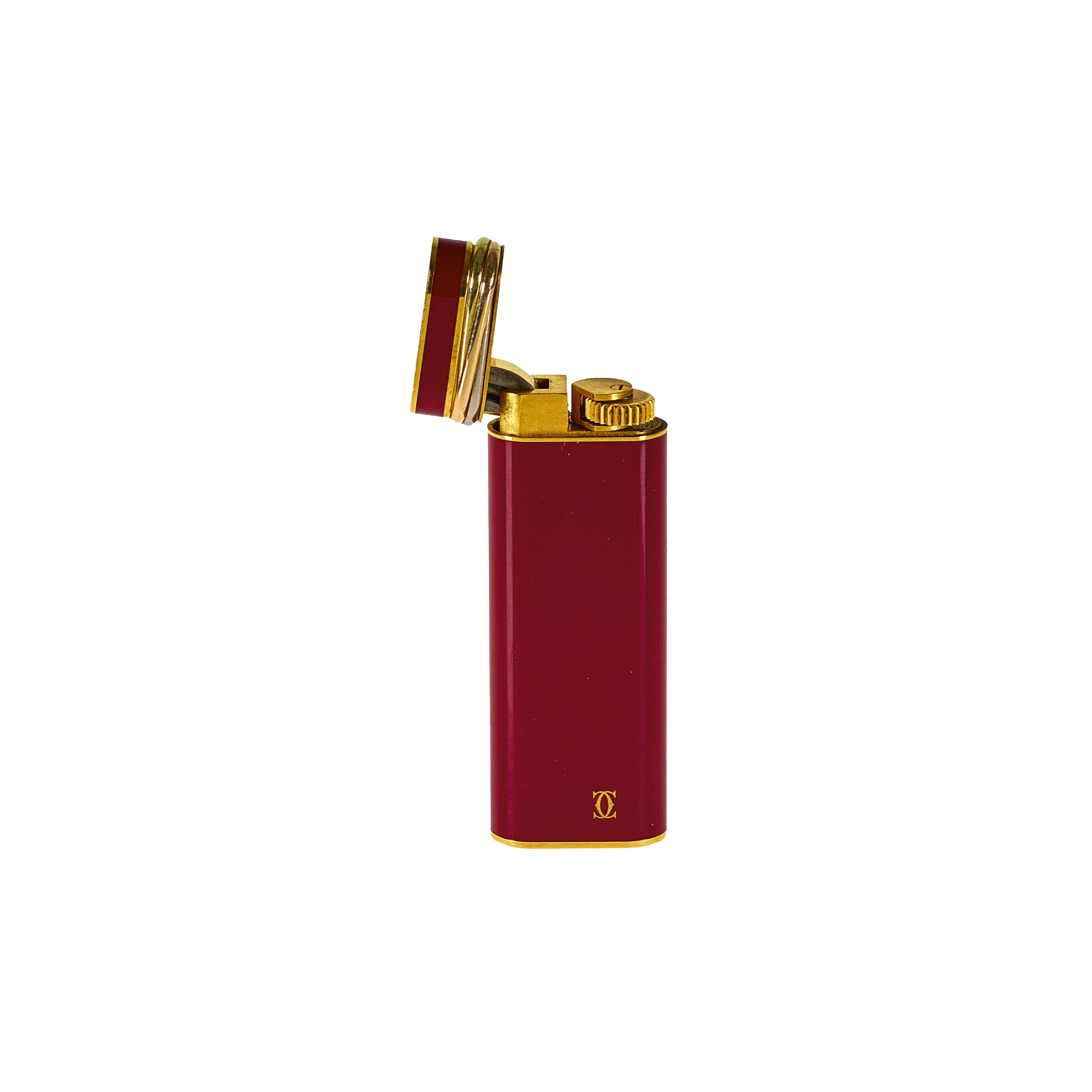 Hochrechteckiges Modell aus vergoldetem Metall und rotbraunem Lack mit abklappbarem Deckel, umfasst von einem "Trinity"-Zopf. Umseitig bez. "Cartier", "Swiss Made", "Plaque Or G" (Nr. N68993). H: 7 cm, B: 2,5 cm, T: 1,2 cm