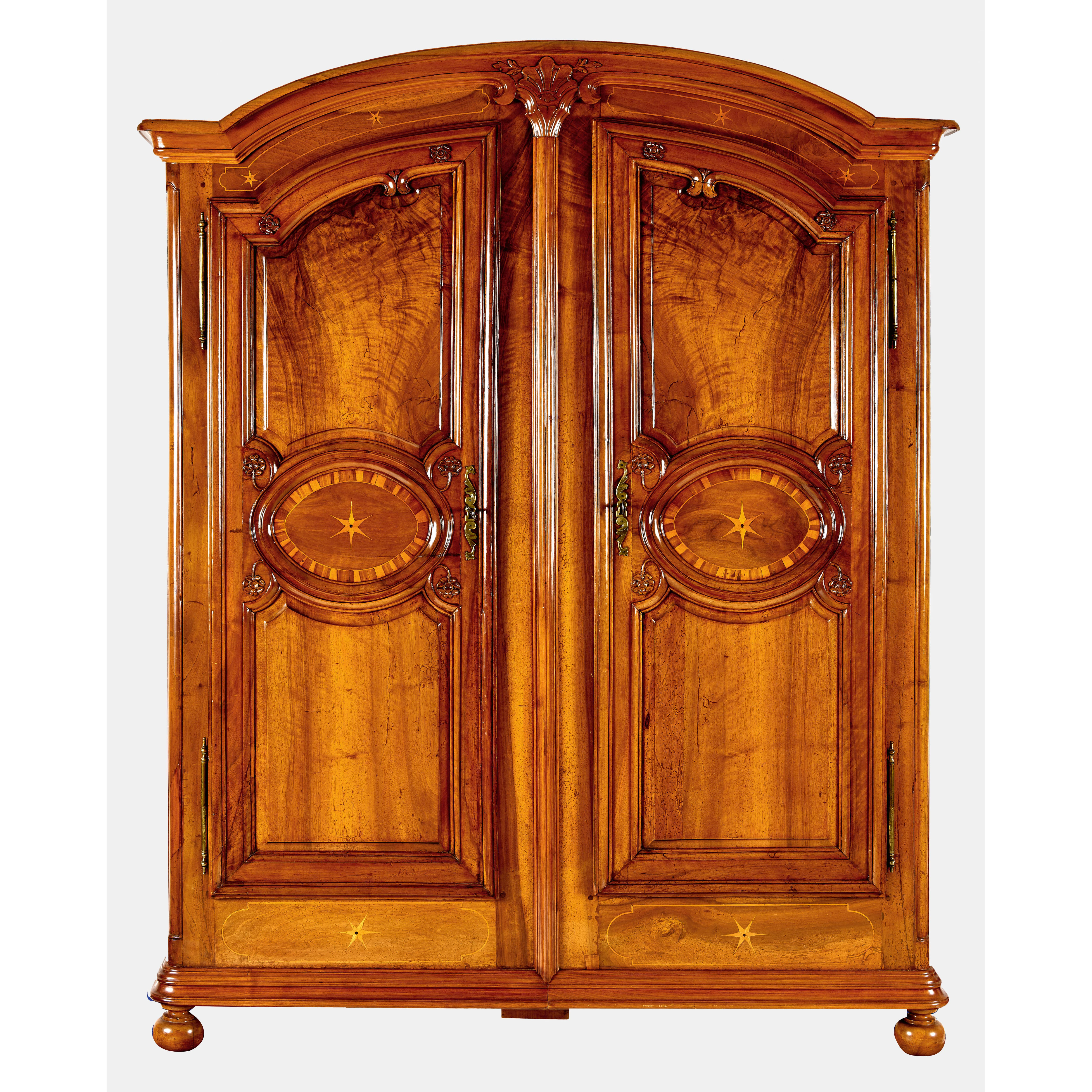 Nussbaum, massiv. Zweitüriger Korpus auf Kugelfüssen. Geschwungenes Kranzgesims mit geschnitztem Muschelmotiv. Rahmenteile der aufgebogten Türen mit floraler Schnitzerei, zwei Medaillons und Einlegearbeiten aus Ahorn. Mittelstab und geschrägte Ecken profiliert. Innen Einlegeböden und vier kleine Schubladen, zwei hinter abschliessbarem Türchen.