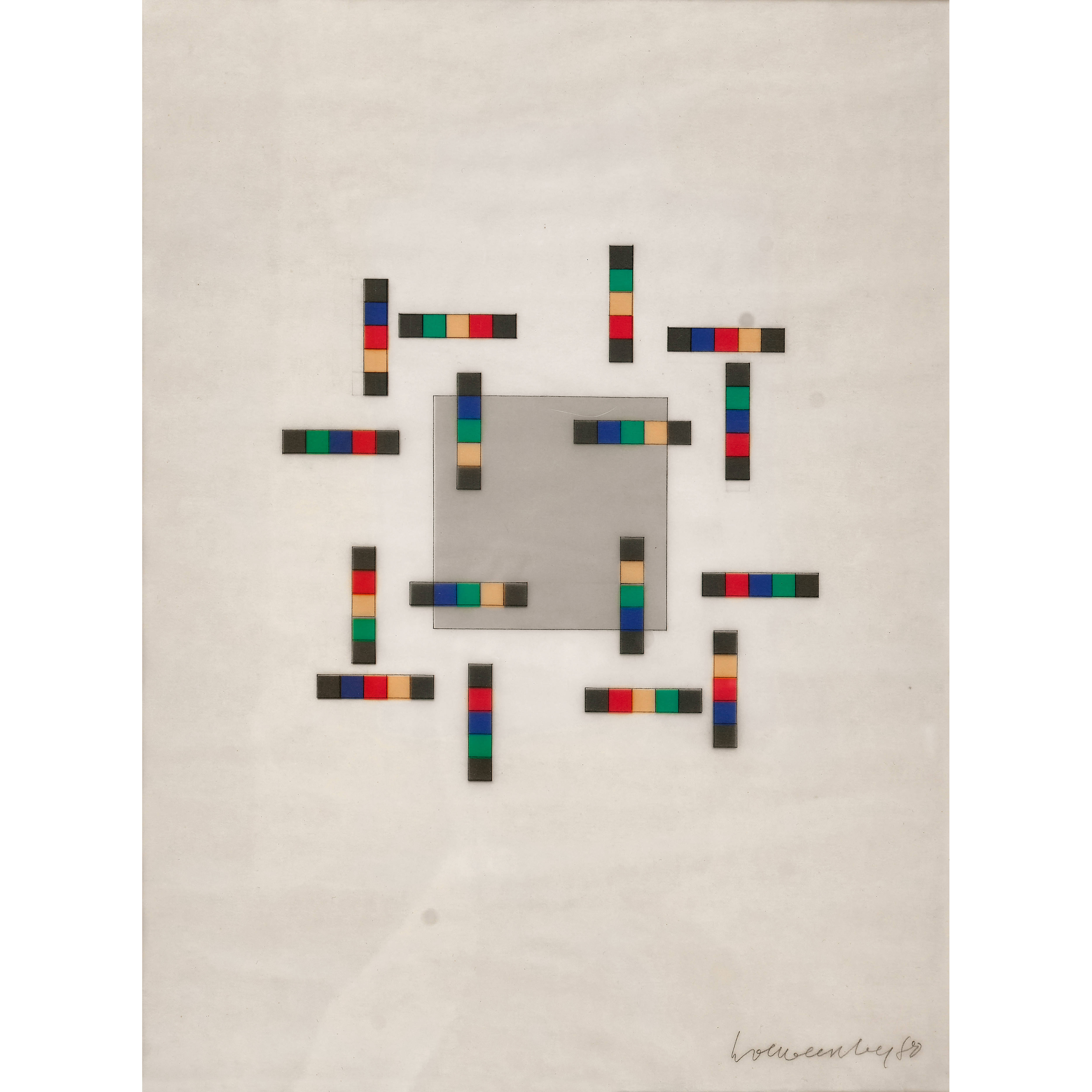 Beim angebotenen Werk handelt es sich um eine Zeichnung, die exakt auf die darunterliegende Farbserigrafie Nr. 4 aus dem Portfolio "vier variationen um ein quadrat" passt.