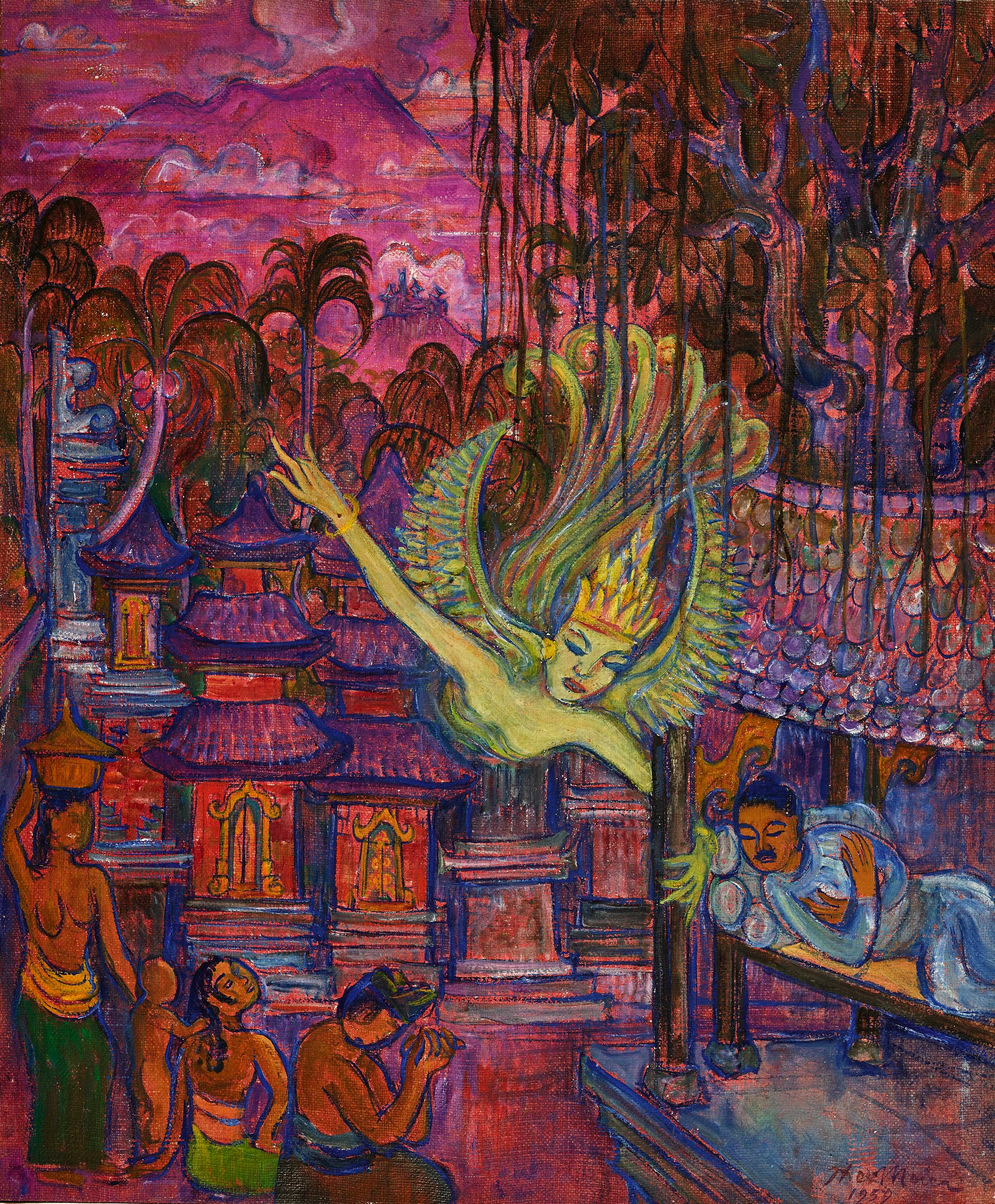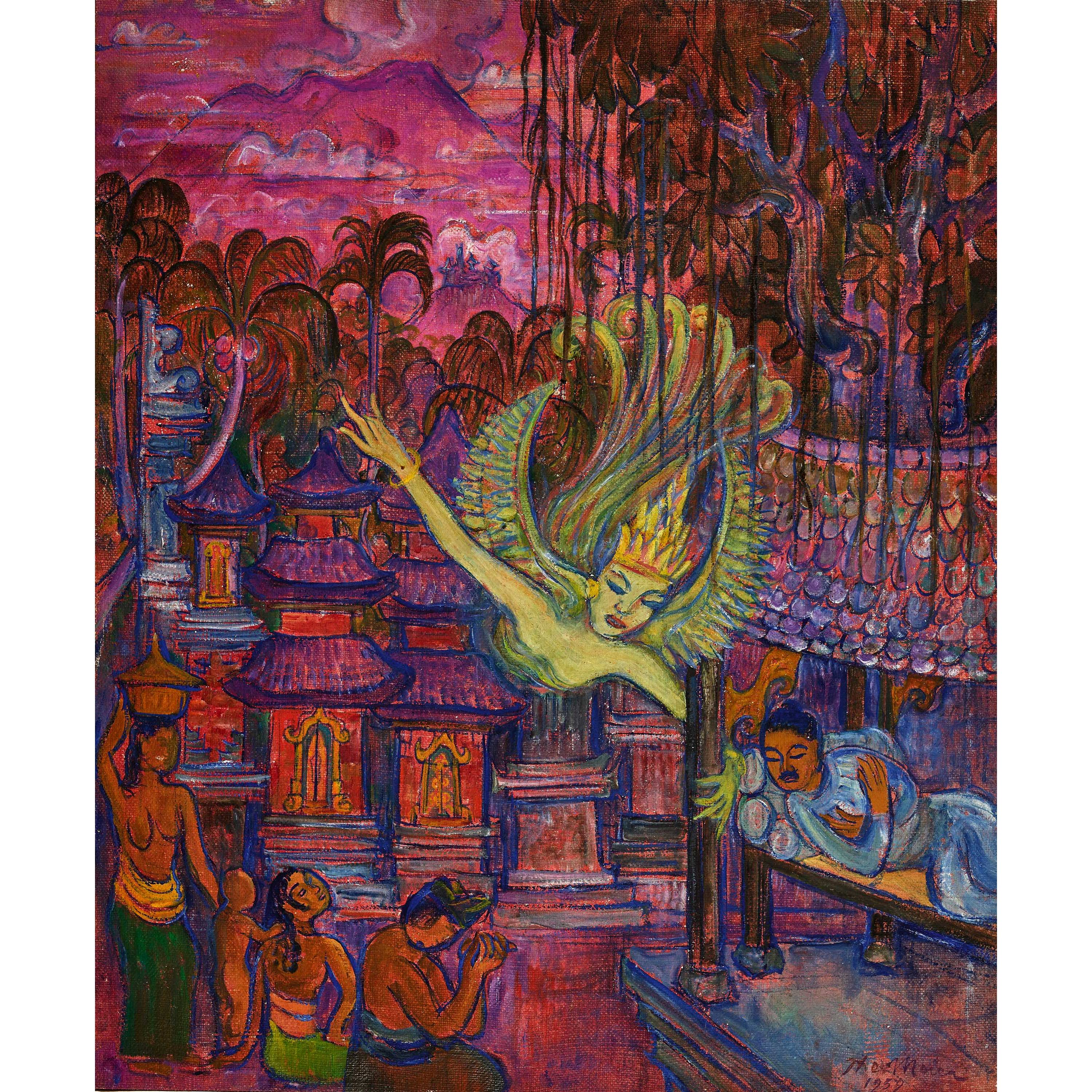 Theo Meier studierte 1925-1929 an der Basler Gewerbeschule und war während eines Deutschlandaufenthaltes 1927 Schüler von Karl Hofer in Berlin und von Otto Dix in Dresden. Ab 1932 lebte der Künstler in Asien, zunächst bis 1934 auf Tahiti, anschliessend bis 1950 auf Bali und ab 1958 bis zu seinem Tod im thailändischen Chiang-Mai. Theo Meier (auch Meier aus Bali oder Theomeier genannt) malte vor allem Landschaften, Kulturstätten und Szenen aus dem täglichen Leben der Einheimischen. Seine Kompositionen können als Hommage an Paul Gaugins Ästhetik, Stil und insbesondere an seine Darstellung lokaler Traditionen aufgefasst werden. Wie Gaugin war Meier ein "nomadischer" Künstler und Abenteurer, der seine Erlebnisse und Eindrücke in Bildern festhielt. In seinen Werken konzentriert sich der Blick in subjektiver und romantisierender Weise auf die Naturgegebenheiten und die Menschen Südostasiens. Wiederkehrende Motive bilden die unterschiedlichen Frauentypen, die er variantenreich in Szene setzt. In Rot-, Orange-, Pink-, und Gelbtönen malte er Tänzerinnen, Göttinnen und Mütter und verquickte hierbei Realität und Fantasie.