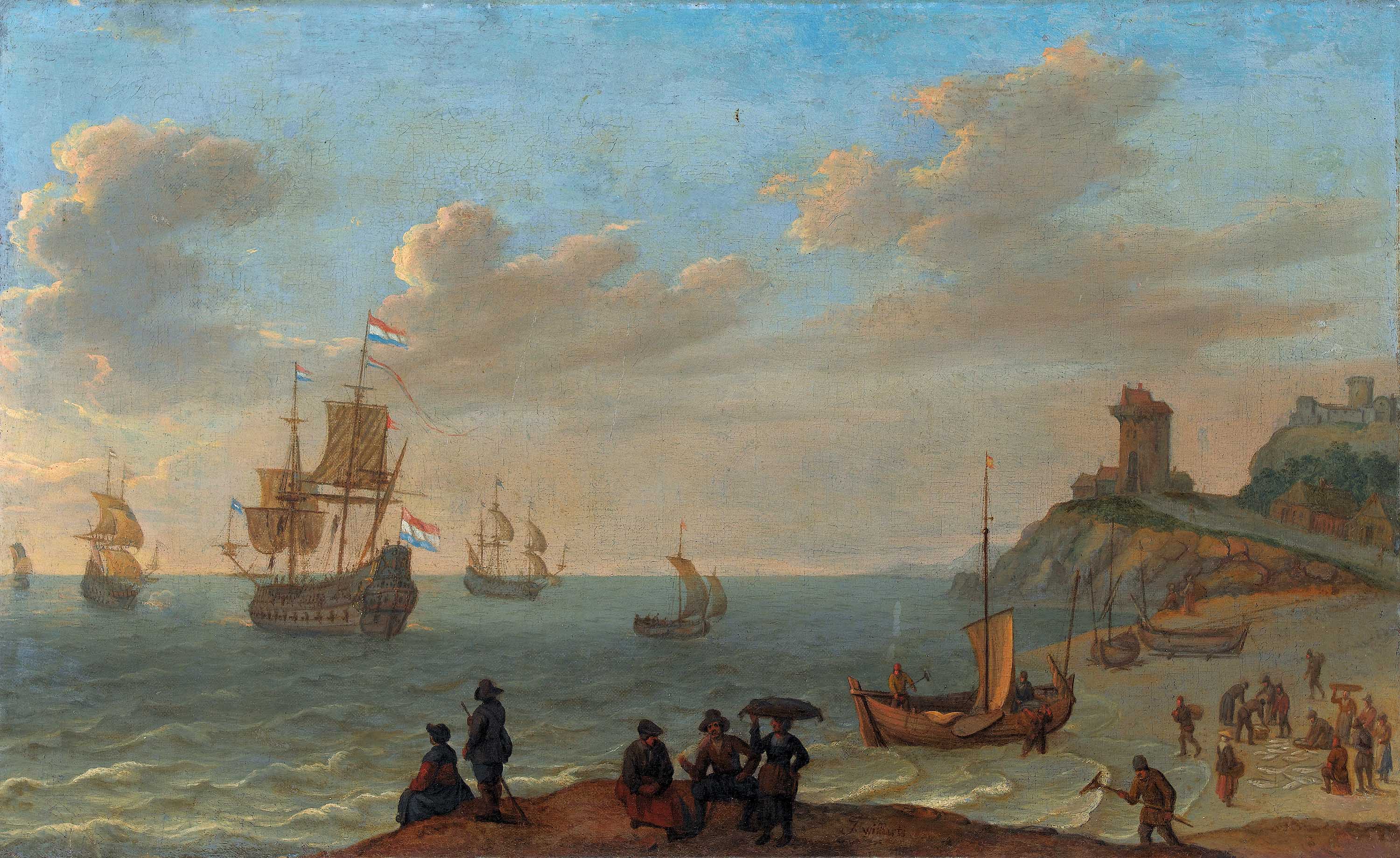 Holländische Küstenlandschaft mit Schiffen und Staffage.