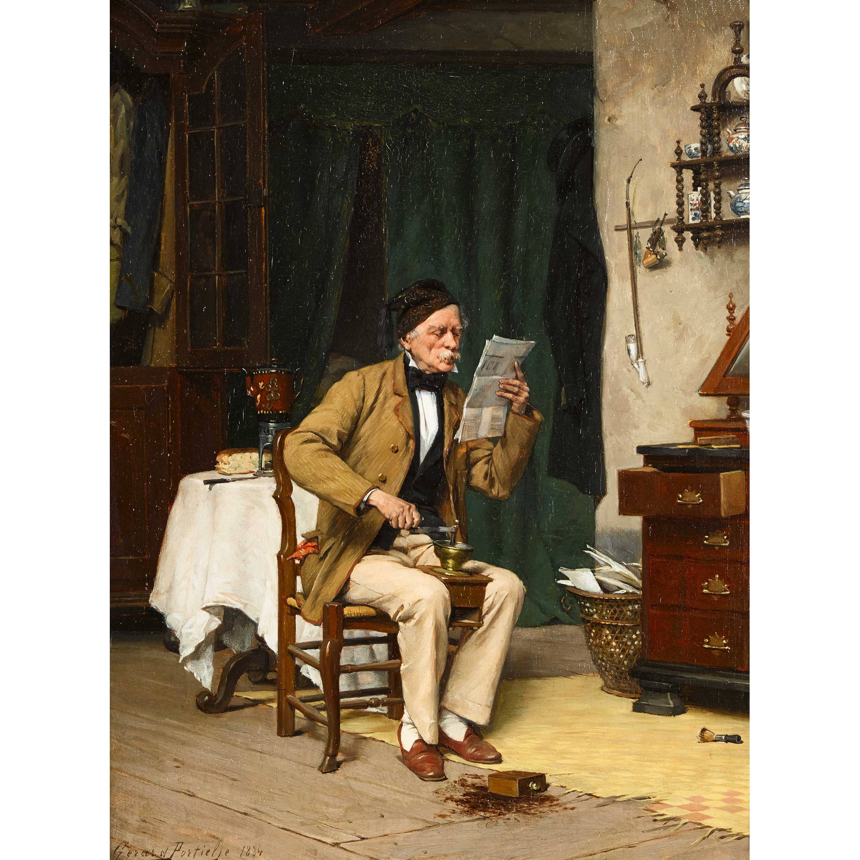 Alter Mann vertieft in die Zeitungslektüre und beim Kaffee mahlen.