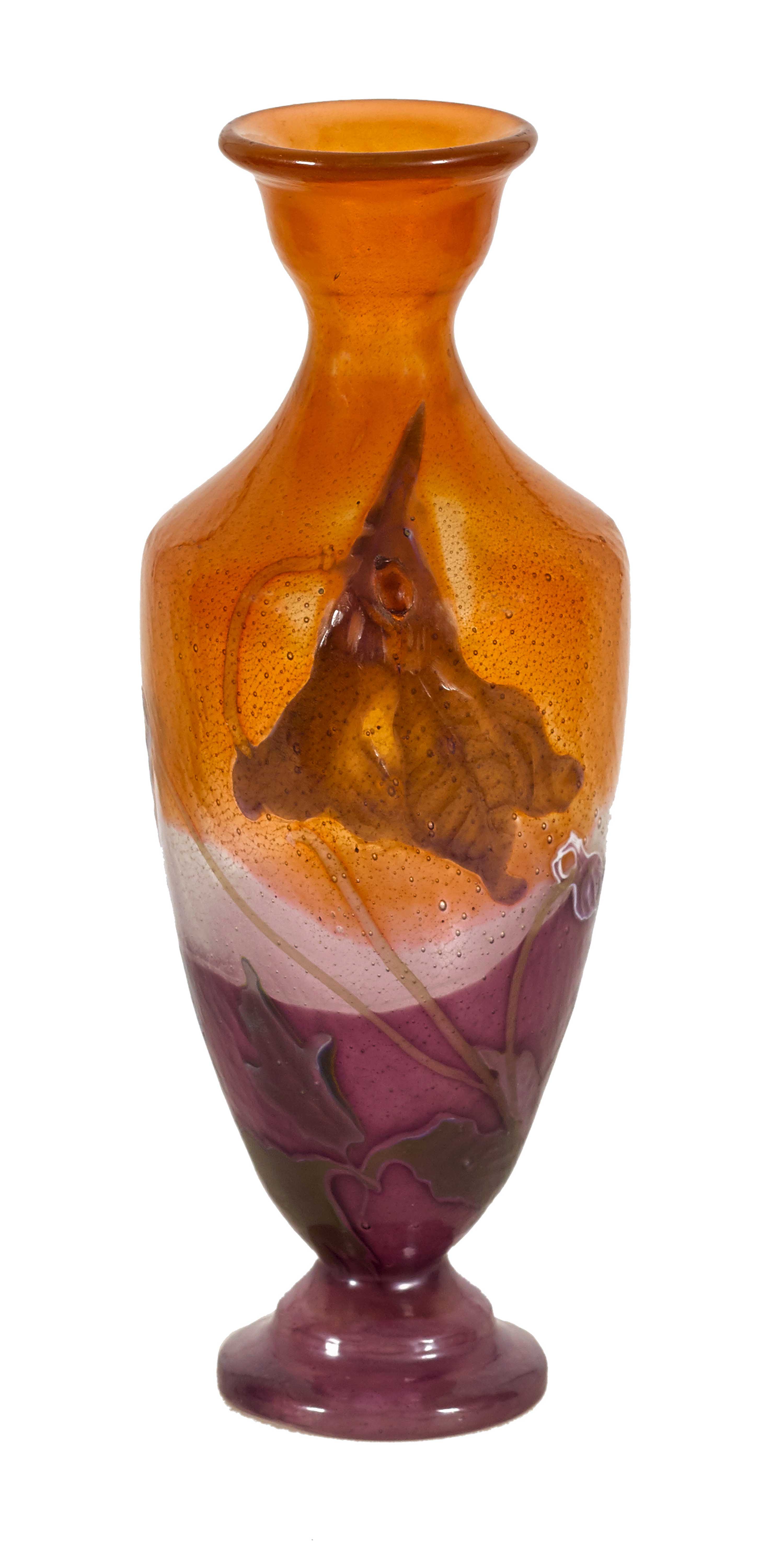 Farbloses, blasiges Glas, orangebraun und violett teilüberfangen, in Marqueterie-Technik eingearbeitete und in Relief geschnittene Glasmotive in Violett, Weiss und Grün,