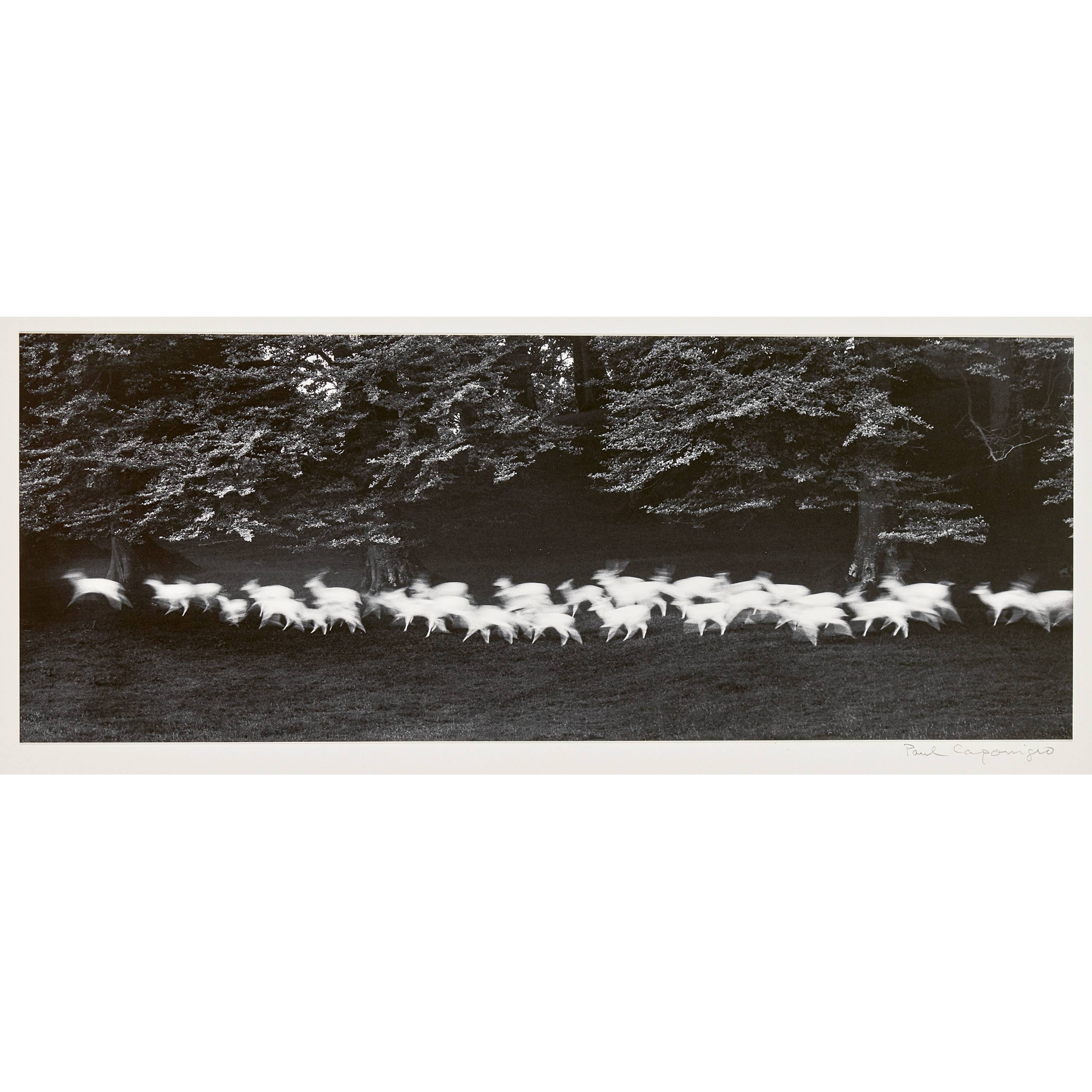 "Running White Deer" zählt zu Paul Caponigros bekanntesten Werken. Die Aufnahme entstand 1967 im südlich von Dublin an der irischen Ostküste gelegenen County Wicklow, ein seit dem aufgehenden 10. Jahrhundert zum Wikingerkönigreich gehörendes und damit geschichtsträchtiges Gebiet, das aufgrund seiner weitgehend unberührten Natur auch als "Garten Irlands" bezeichnet wird. In einem gelängten Querformat wirft Caponigro den Blick auf einen im Schatten liegenden Waldsaum, dessen Baumstämme und -kronen sich friesartig über die gesamte Bildbreite hinziehen. Davor erkennt man - in hartem Helldunkel-Kontrast - eine nach links fliehende Herde weisser Hirsche, deren Körperumrisse sich durch die lange Belichtungszeit nahezu aufzulösen scheinen. Dadurch gelingt es dem Fotografen, das Motiv der hektischen Flucht ästhetisch zu verstärken, und die Herde gleichzeitig als geisterhaft-flüchtige Erscheinung in Szene zu setzen. "Running White Deer" zeigt exemplarisch Caponigros künstlerische Überzeugung, dass die Inspiration des Fotografen gegenüber der Technik vorgehe und dass ein perfekter Abzug nur Ausdruck einer inneren Vorstellungskraft sei. Wie Edward Weston war er überzeugt, dass der Fotograf mit seiner Intuition einen Augenblick von Einheit zu erfassen vermag, der über die blosse menschliche Wahrnehmung hinausgeht. In seinen Aufnahmen aus England und Irland, die er mit Hilfe eines Guggenheim-Stipendums bereiste und zu denen auch das vorliegende Werk gehört, versuchte Caponigro zu visualisieren, wie Natur und Kultur durch persönliche Anschauung zu einem allgemeingültigen Sinnbild von Zeit und Zeitlosigkeit werden können. So verweist auf unserer Fotografie das Motiv des weissen Hirsches, der eine prominente Rolle in der Mythologie vieler Kulturen spielt, über sich hinaus auch auf die an Mythen und Legenden reiche Geschichte Irlands.