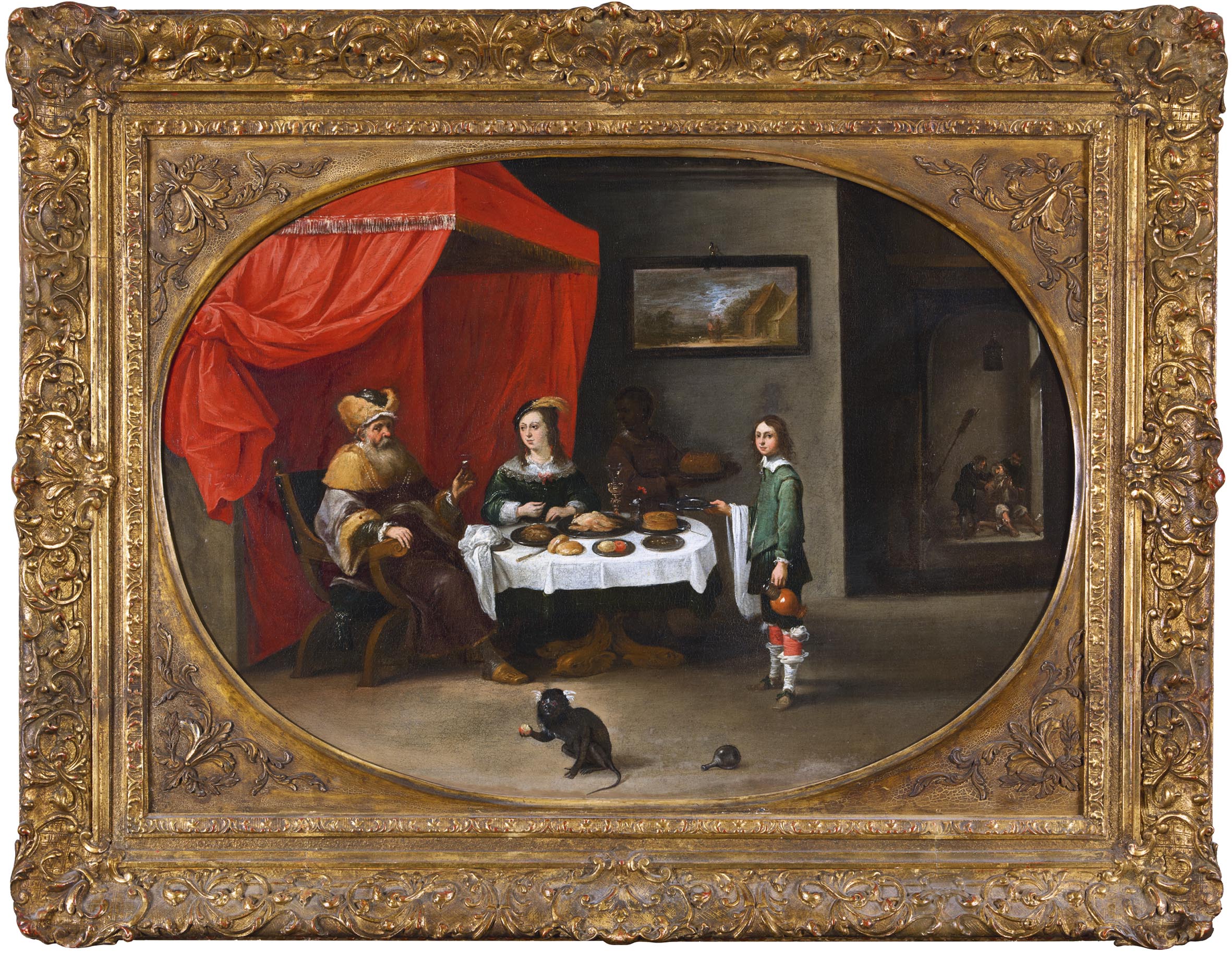 The Musée du Louvre in Paris owns a drawing (inventory no. 20530) with an almost identical composition, which only differs from our work through the absence of the monkey. In addition, the same composition as ours was engraved by Marie Riolett in the 18th century, which her husband Jacques-Firmin Beauvarlet published under the title "Le mauvais riche".