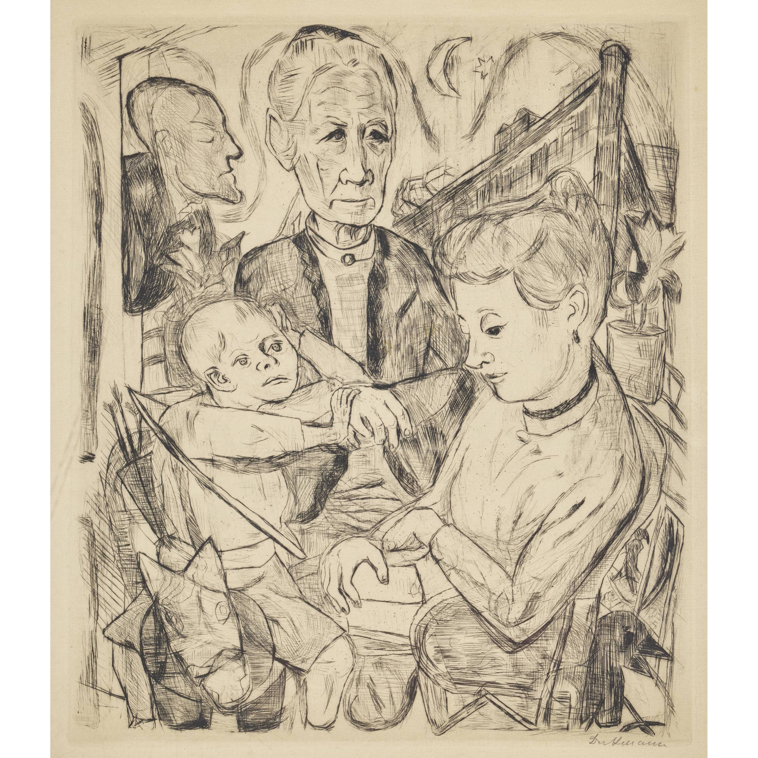 Das angebotene Werk zeigt Max Beckmanns Frau Minna Beckmann-Tube, seinen Sohn Peter, sowie die Mutter seiner Gattin, Ida Tube. Das Familienporträt wird ergänzt durch ein von ihm eingefügtes Selbstporträt in der linken oberen Bildhälfte.